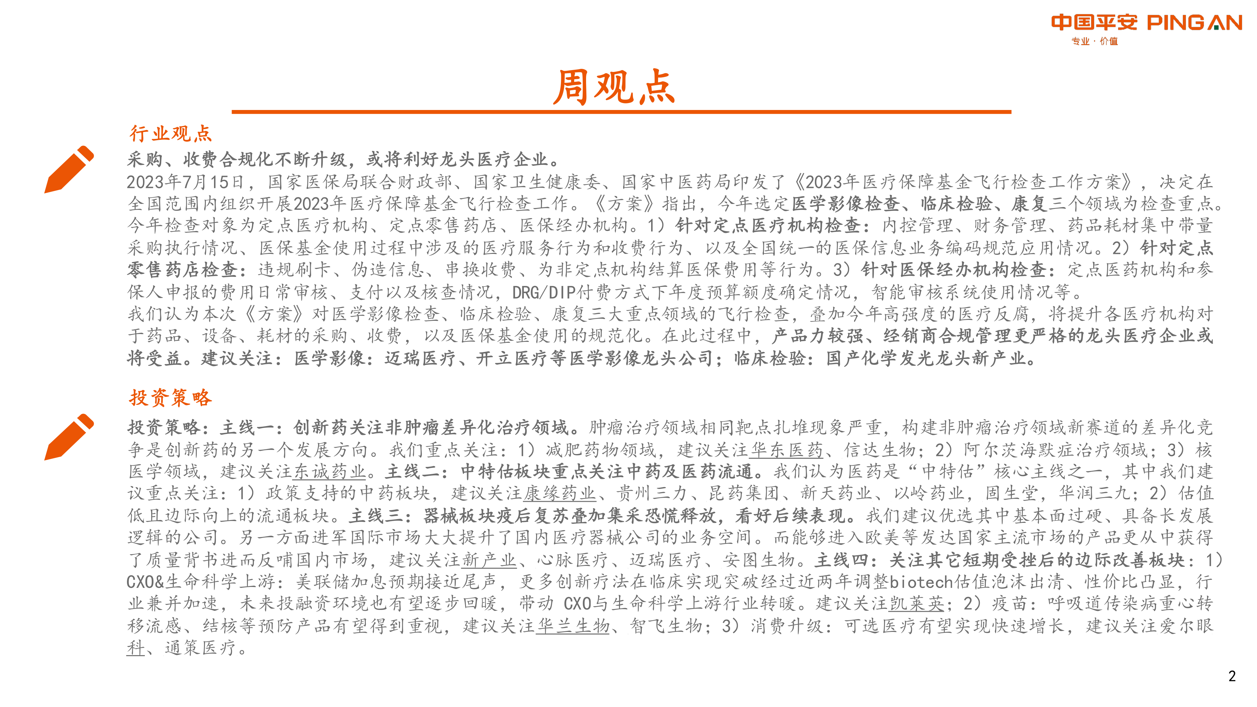 投资策略:主线一:创新药关注非肿瘤差异化治疗领域。肿瘤治疗领域相同靶点扎堆现象严重,构建非肿瘤治疗领域新赛道的差异化竞争是创新药的另一个发展方向。我们重点关注:1)减肥药物领域,建议关注华东医药、信达生物;2)阿尔茨海默症治疗领域;3)核医学领域,建议关注东诚药业。主线二:中特估板块重点关注中药及医药流通。我们认为医药是“中特估”核心主线之一,其中我们建议重点关注:1)政策支持的中药板块,建议关注康缘药业、贵州三力、昆药集团、新天药业、以岭药业,固生堂,华润三九;2)估值低且边际向上的流通板块。主线三:器械板块疫后复苏叠加集采恐慌释放,看好后续表现。我们建议优选其中基本面过硬、具备长发展逻辑的公司。另一方面进军国际市场大大提升了国内医疗器械公司的业务空间。而能够进入欧美等发达国家主流市场的产品更从中获得了质量背书进而反哺国内市场,建议关注新产业、心脉医疗、迈瑞医疗、安图生物。主线四:关注其它短期受挫后的边际改善板块:1)CXO&生命科学上游:美联储加息预期接近尾声,更多创新疗法在临床实现突破经过近两年调整biotech估值泡沫出清、性价比凸显,行业兼并加速,未来投融资环境也有望逐步回暖,带动CXO与生命科学上游行业转暖。建议关注凯莱英;2)疫苗:呼吸道传染病重心转移流感、结核等预防产品有望得到重视,建议关注华兰生物、智飞生物;3)消费升级:可选医疗有望实现快速增长,建议关注爱尔眼科、通策医疗。