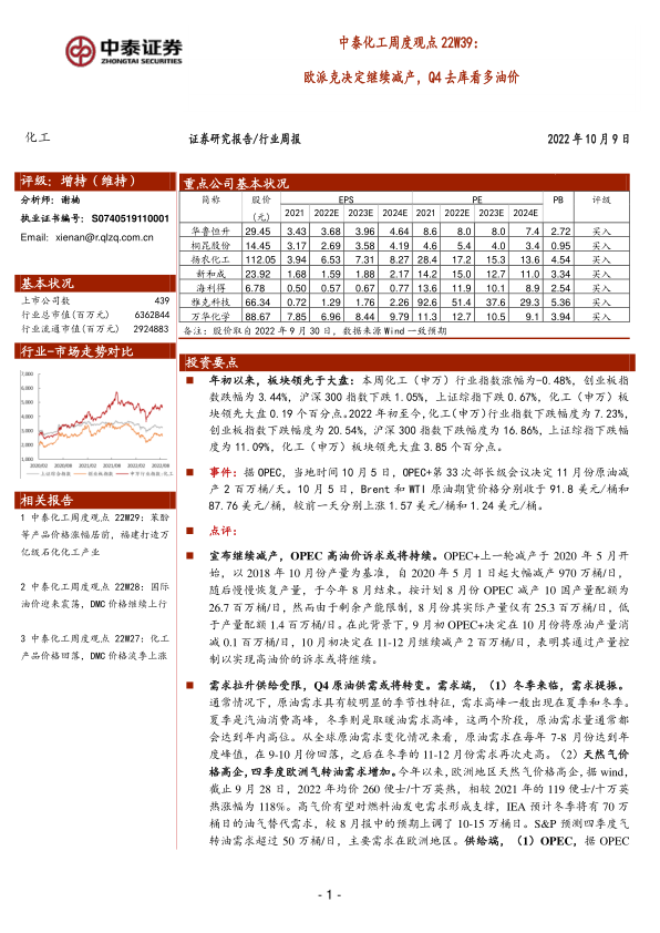 中泰化工周度观点22W39:欧派克决定继续减产,Q4去库看多油价