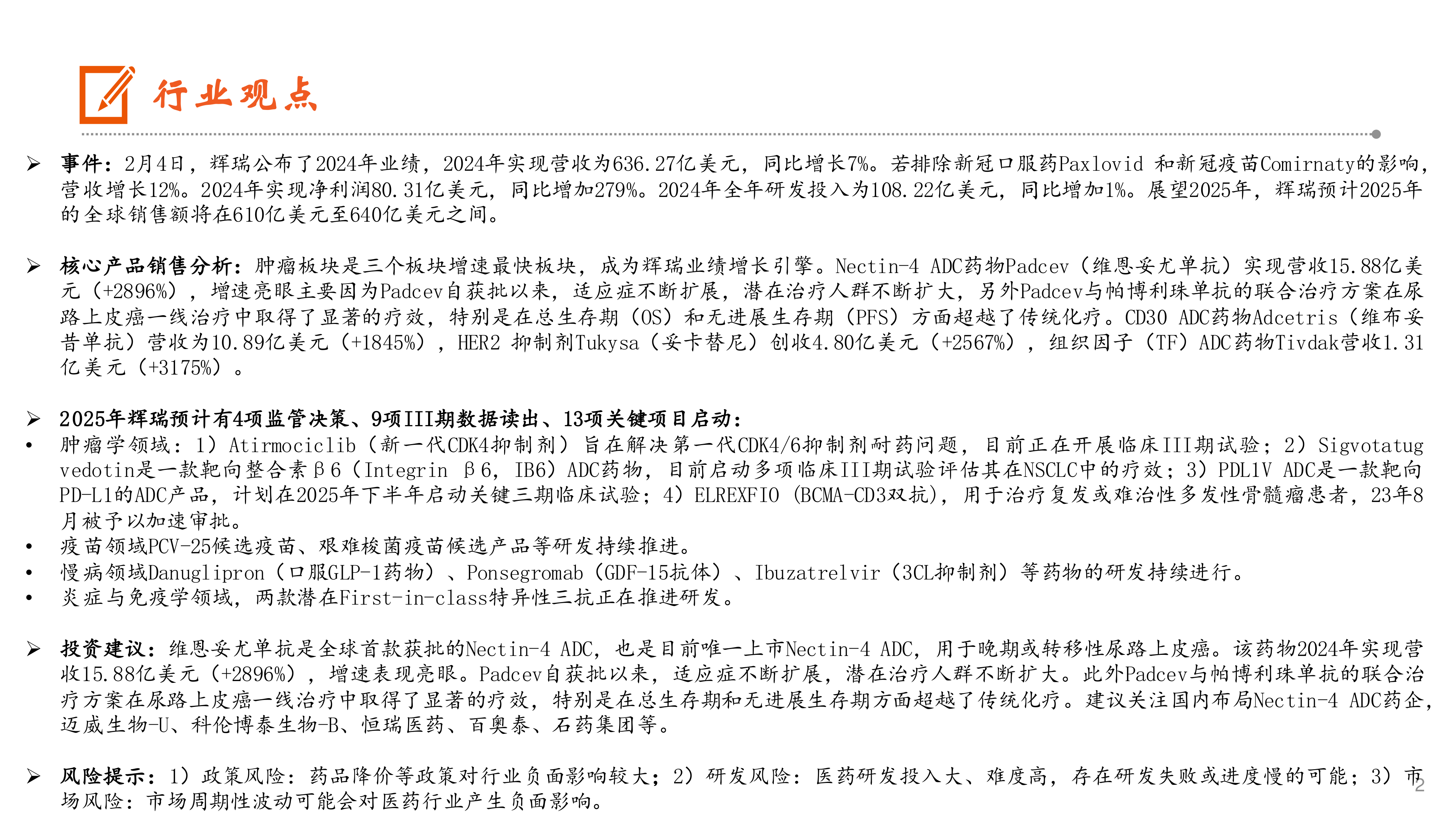 本报告的核心观点是:辉瑞2024年业绩强劲反弹,肿瘤板块成为主要增长引擎,Nectin-4 ADC药物Padcev表现尤其亮眼,其营收增长显著,并展现出优异的临床疗效。辉瑞2025年将继续推进肿瘤学、疫苗、慢病和炎症与免疫学等领域的研发管线,预计销售额将在610亿美元至640亿美元之间。报告建议关注国内布局Nectin-4 ADC的药企。