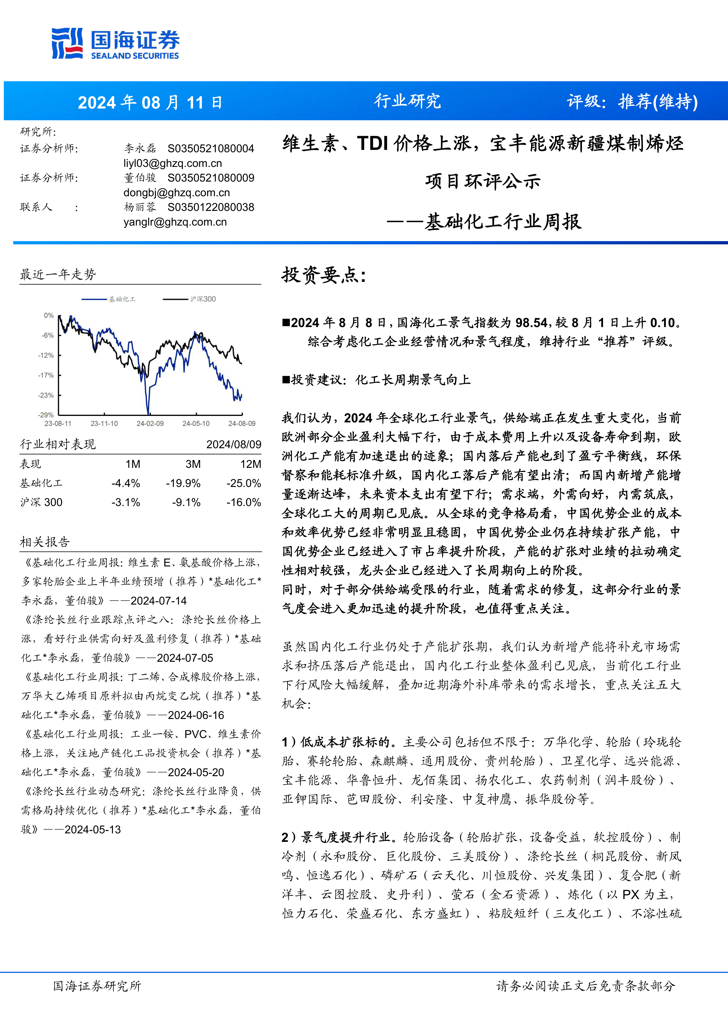 报告首先指出,2024年8月8日,国海化工景气指数为98.54,较8月1日上升0.10,维持行业“推荐”评级。基础化工行业指数跑赢沪深300指数。