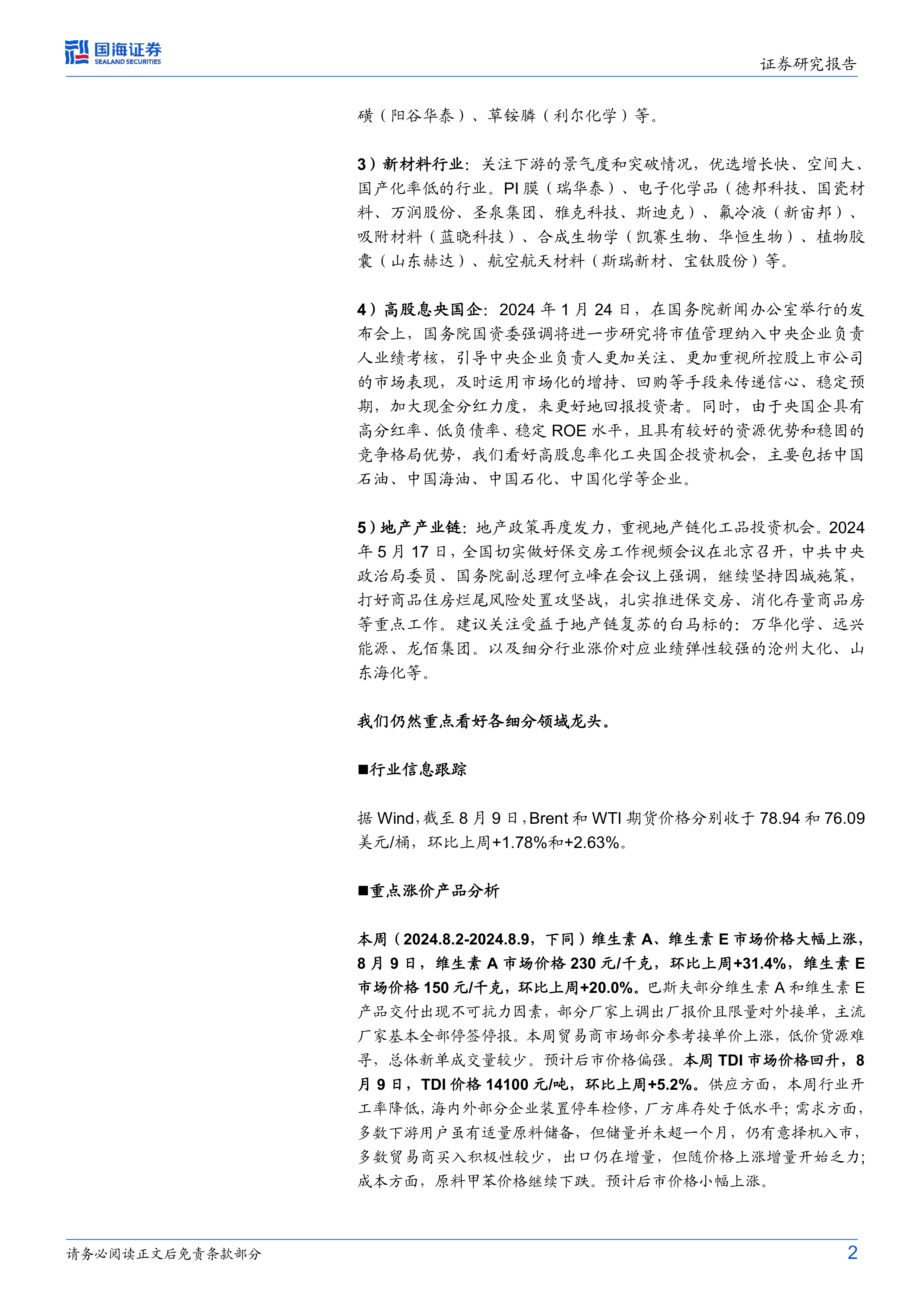 本周(2024.8.2-2024.8.9,下同)维生素A、维生素E市场价格大幅上涨,8月9日,维生素A市场价格230元/千克,环比上周+31.4%,维生素E市场价格150元/千克,环比上周+20.0%。巴斯夫部分维生素A和维生素E产品交付出现不可抗力因素,部分厂家上调出厂报价且限量对外接单,主流厂家基本全部停签停报。本周贸易商市场部分参考接单价上涨,低价货源难寻,总体新单成交量较少。预计后市价格偏强。本周TDI市场价格回升,8月9日,TDI价格14100元/吨,环比上周+5.2%。供应方面,本周行业开工率降低,海内外部分企业装置停车检修,厂方库存处于低水平;需求方面,多数下游用户虽有适量原料储备,但储量并未超一个月,仍有意择机入市,多数贸易商买入积极性较少,出口仍在增量,但随价格上涨增量开始乏力;成本方面,原料甲苯价格继续下跌。预计后市价格小幅上涨。