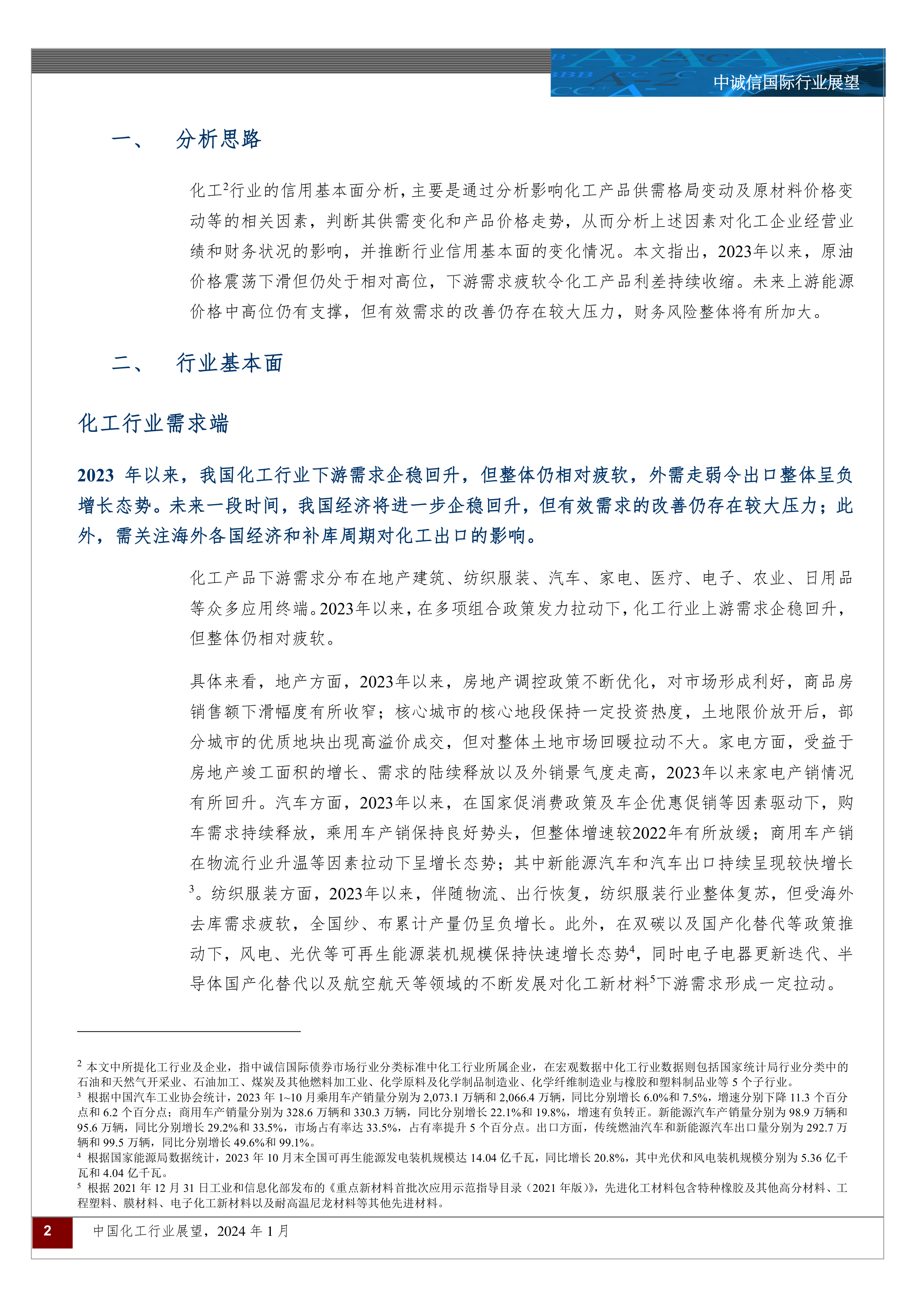 本报告基于中诚信国际对中国化工行业2024年1月展望的分析,核心观点如下: