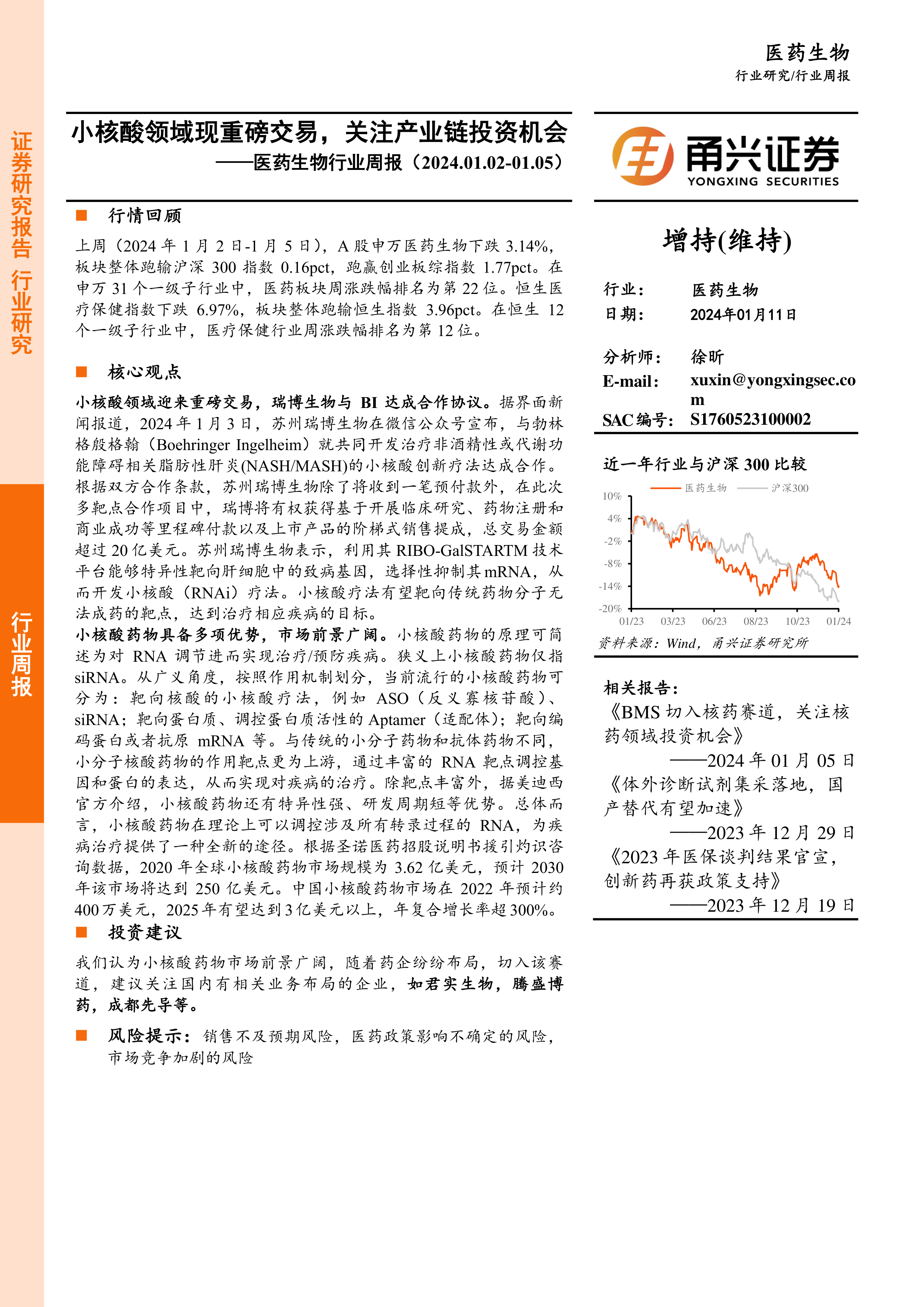 本报告通过对2024年1月2日至5日医药生物行业市场表现、公司动态以及小核酸领域重磅交易的分析,得出小核酸药物市场前景广阔的结论。瑞博生物与勃林格殷格翰的合作协议是该领域的重要里程碑事件,为产业链投资提供了新的机会。 然而,投资者仍需关注潜在的市场风险,谨慎决策。 报告中提供的市场数据和公司信息仅供参考,不构成投资建议。