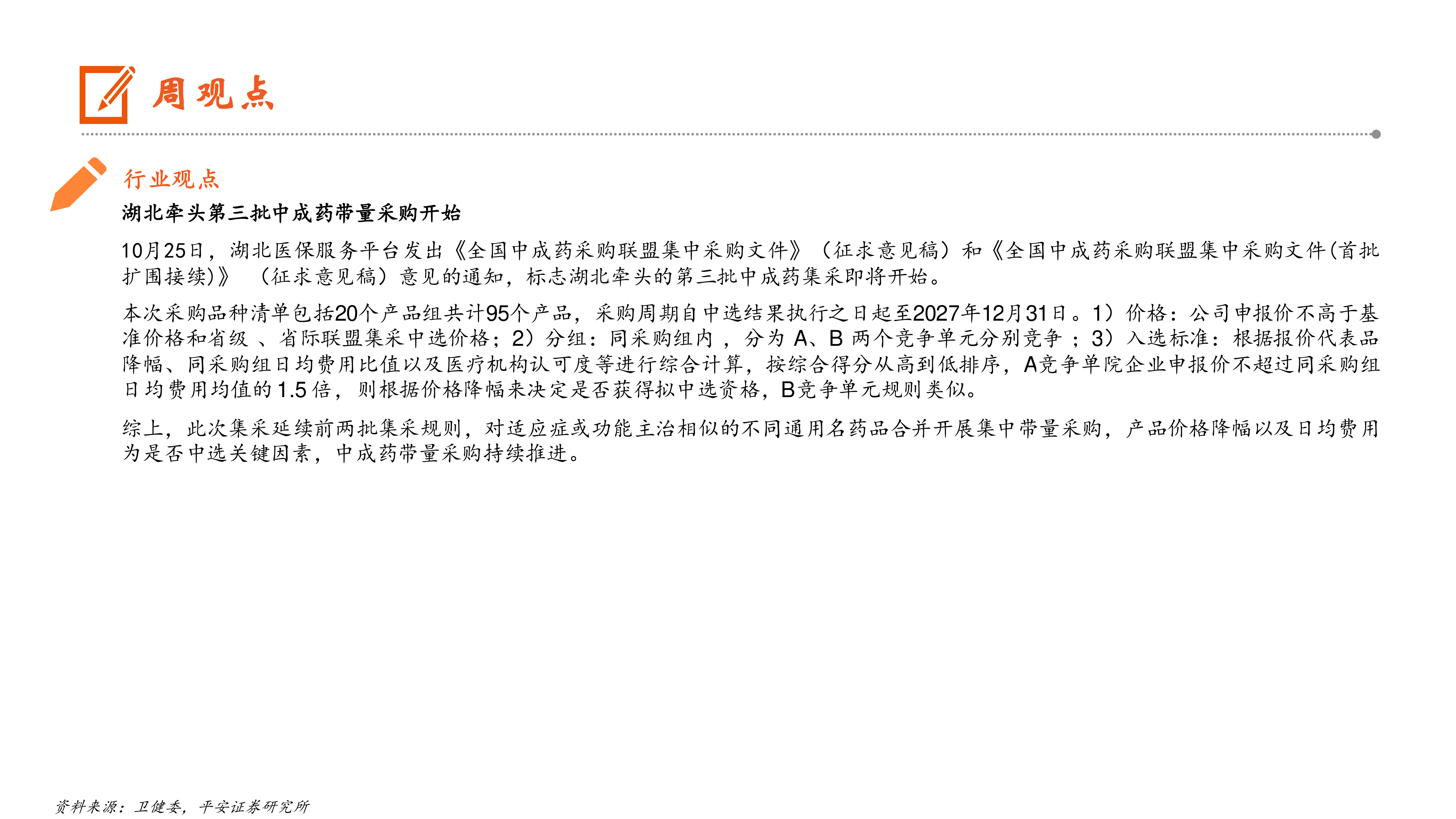 1)卫健委支持更多中成药、中药饮片纳入医保支付范围;2)湖北牵头中成药第三批全国集采开始;3)国家药监局发布关于境