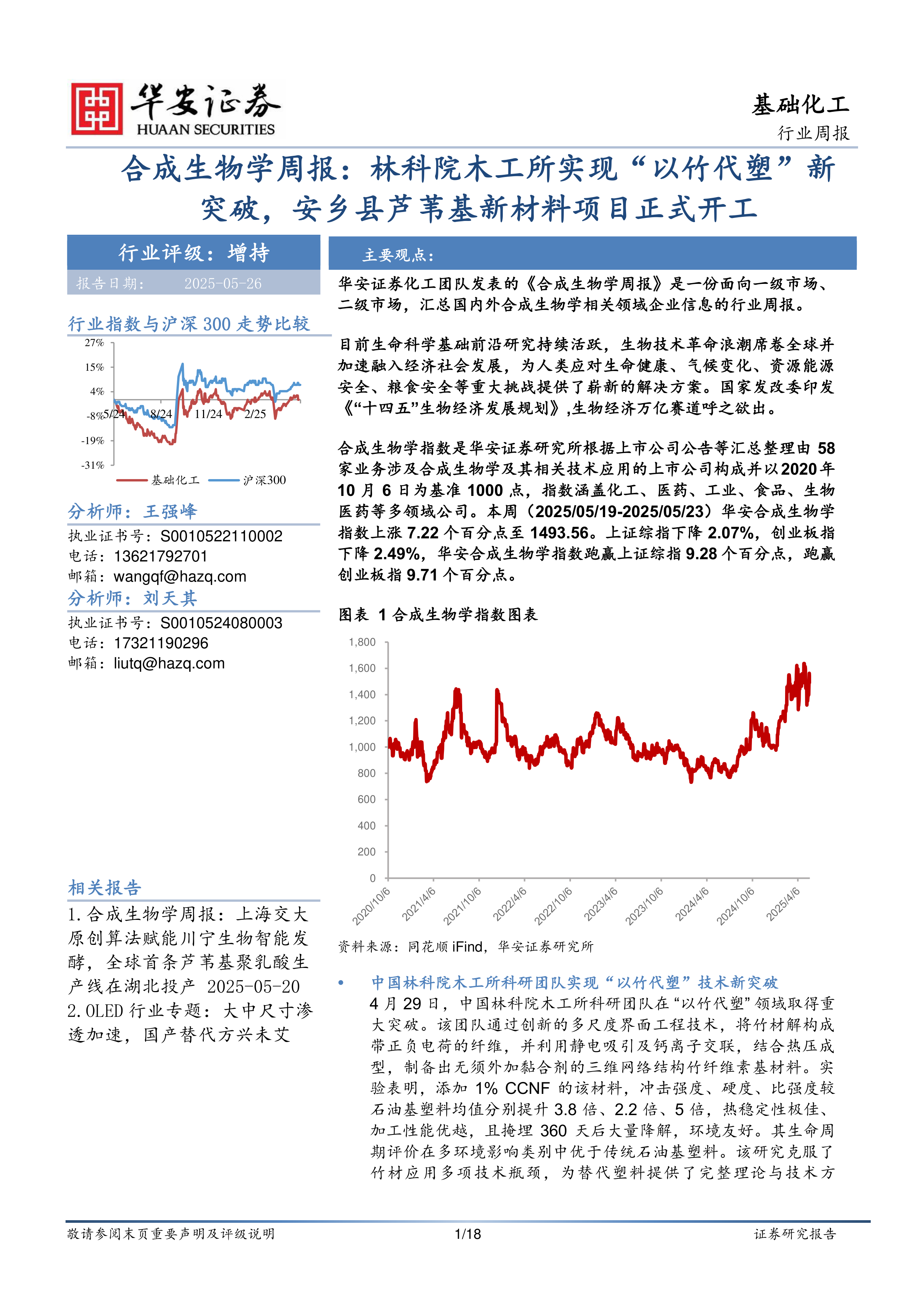 合成生物学指数是华安证券研究所根据上市公司公告等汇总整理由58家业务涉及合成生物学及其相关技术应用的上市公司构成并以2020年10月6日为基准1000点,指数涵盖化工、医药、工业、食品、生物医药等多领域公司。本周(2025/05/19-2025/05/23)华安合成生物学指数上涨7.22个百分点至1493.56。上证综指下降2.07%,创业板指下降2.49%,华安合成生物学指数跑赢上证综指9.28个百分点,跑赢创业板指9.71个百分点。