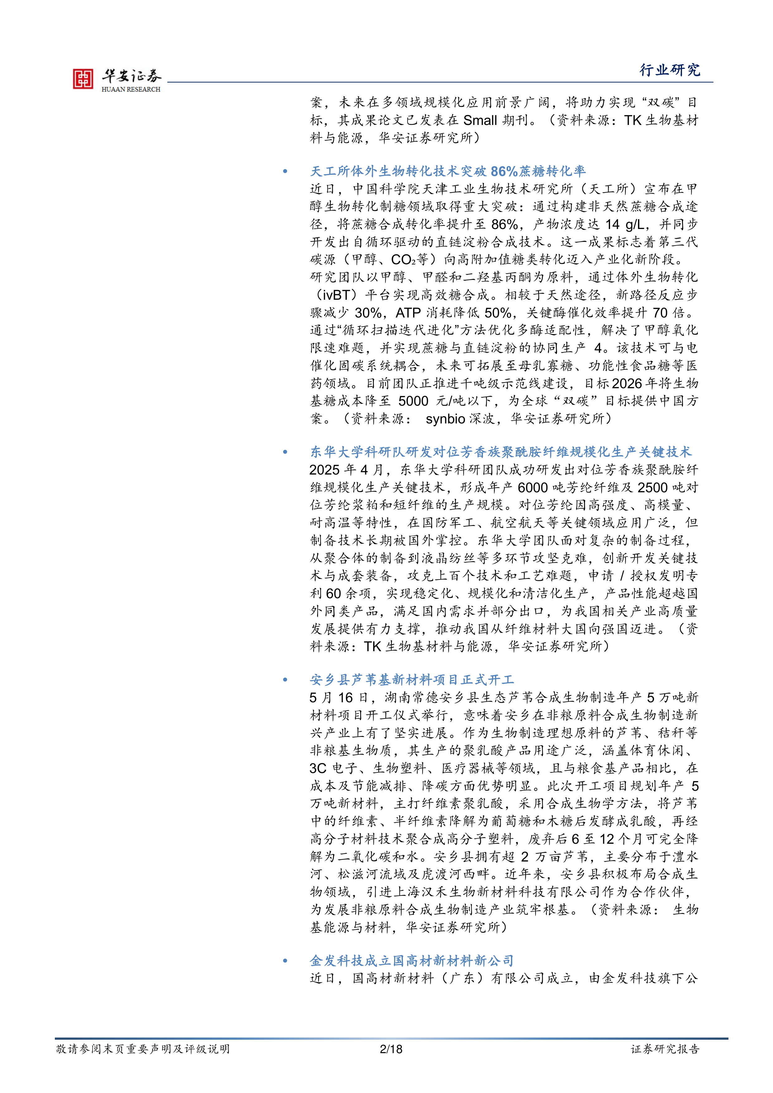 东华大学科研队研发对位芳香族聚酰胺纤维规模化生产关键技术2025年4月,东华大学科研团队成功研发出对位芳香族聚酰胺纤维规模化生产关键技术,形成年产6000吨芳纶纤维及2500吨对位芳纶浆粕和短纤维的生产规模。对位芳纶因高强度、高模量、耐高温等特性,在国防军工、航空航天等关键领域应用广泛,但制备技术长期被国外掌控。东华大学团队面对复杂的制备过程,从聚合体的制备到液晶纺丝等多环节攻坚克难,创新开发关键技术与成套装备,攻克上百个技术和工艺难题,申请/授权发明专利60余项,实现稳定化、规模化和清洁化生产,产品性能超越国外同类产品,满足国内需求并部分出口,为我国相关产业高质量发展提供有力支撑,推动我国从纤维材料大国向强国迈进。(资料来源:TK生物基材料与能源,华安证券研究所)