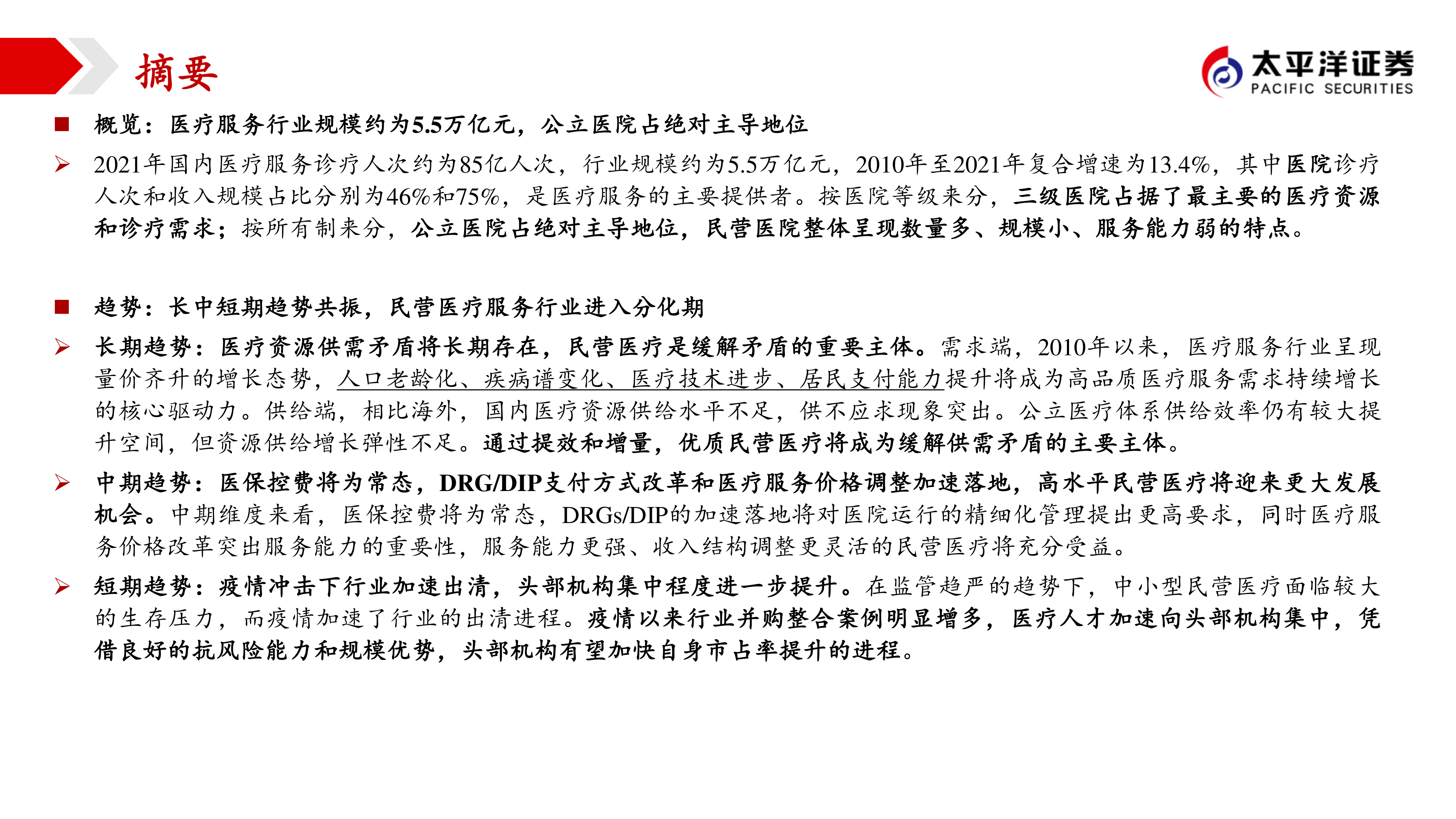 本节首先概述了中国医疗服务行业的整体规模和构成,指出医院是医疗服务的主要提供者,公立医院占据主导地位。随后,报告从长期、中期和短期三个维度分析了行业发展趋势:长期来看,供需矛盾将长期存在,民营医疗是缓解矛盾的重要力量;中期来看,医保控费和DRG/DIP支付方式改革将对医院精细化管理提出更高要求,高水平民营医疗将受益;短期来看,疫情冲击加速了行业出清,头部机构集中度提升。