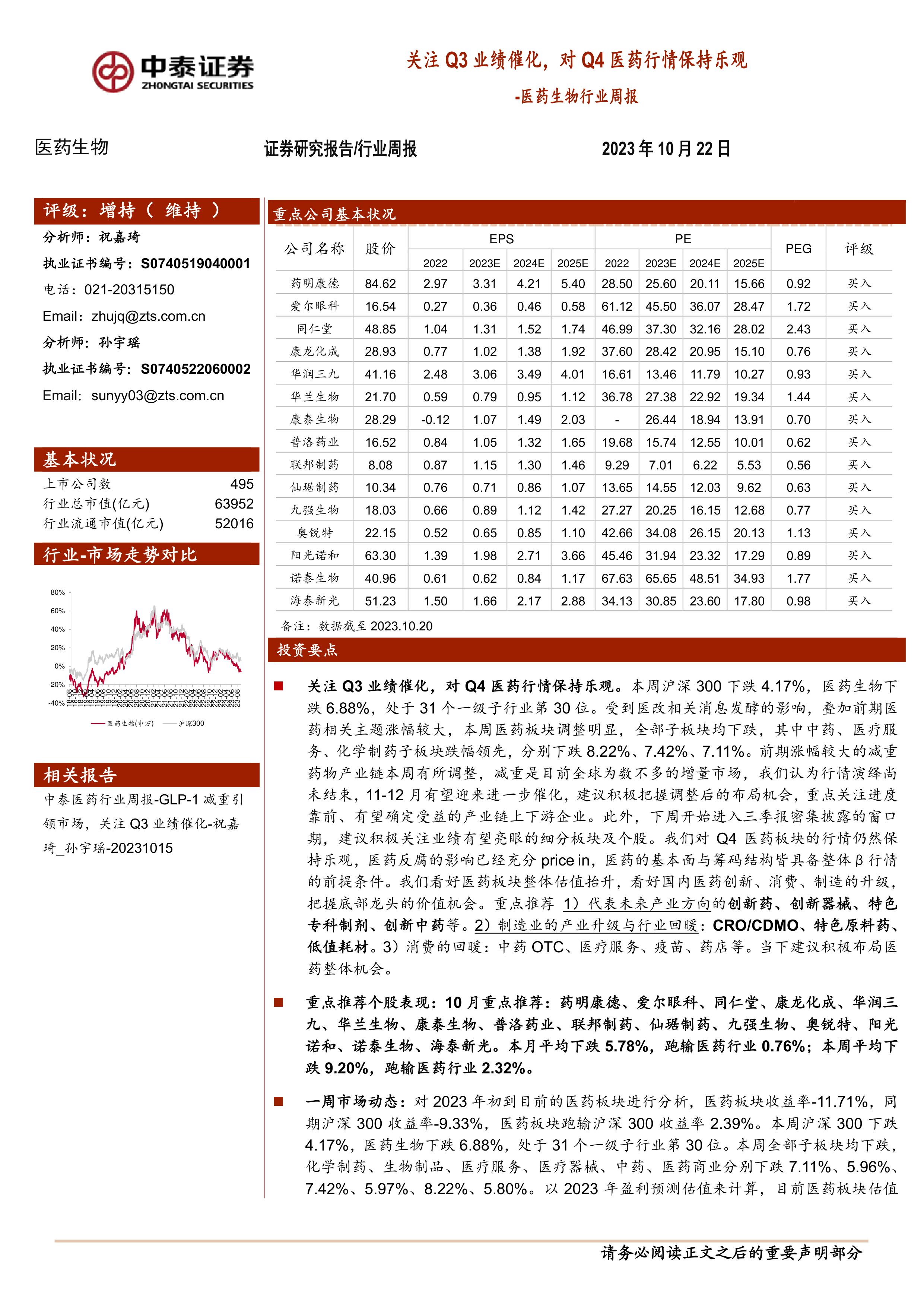 本报告的核心观点是:尽管本周医药生物行业整体下跌,跑输沪深300指数,但基于对Q3业绩催化效应的关注以及医药反腐影响已充分price in的判断,我们对Q4医药行情保持乐观。 报告建议积极把握调整后的布局机会,重点关注业绩有望亮眼的细分板块及个股,并推荐了多个具有增长潜力的细分领域和个股。