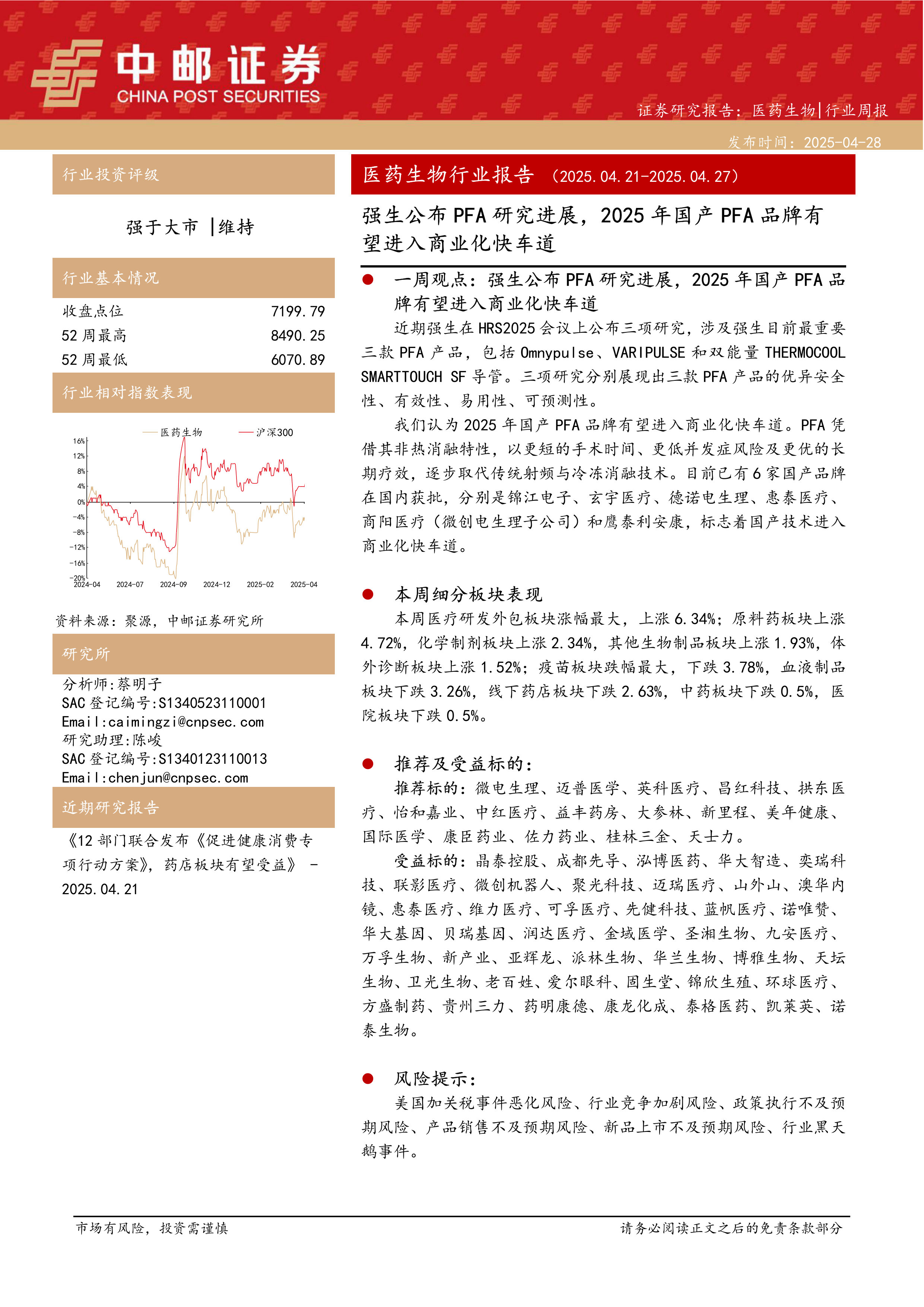 本报告的核心观点是:2025年,国产PFA品牌有望进入商业化快车道,并凭借其技术优势逐步取代传统射频与冷冻消融技术;同时,医药生物行业整体表现疲软,但部分细分领域如创新药、高端医疗器械等仍存在结构性投资机会。