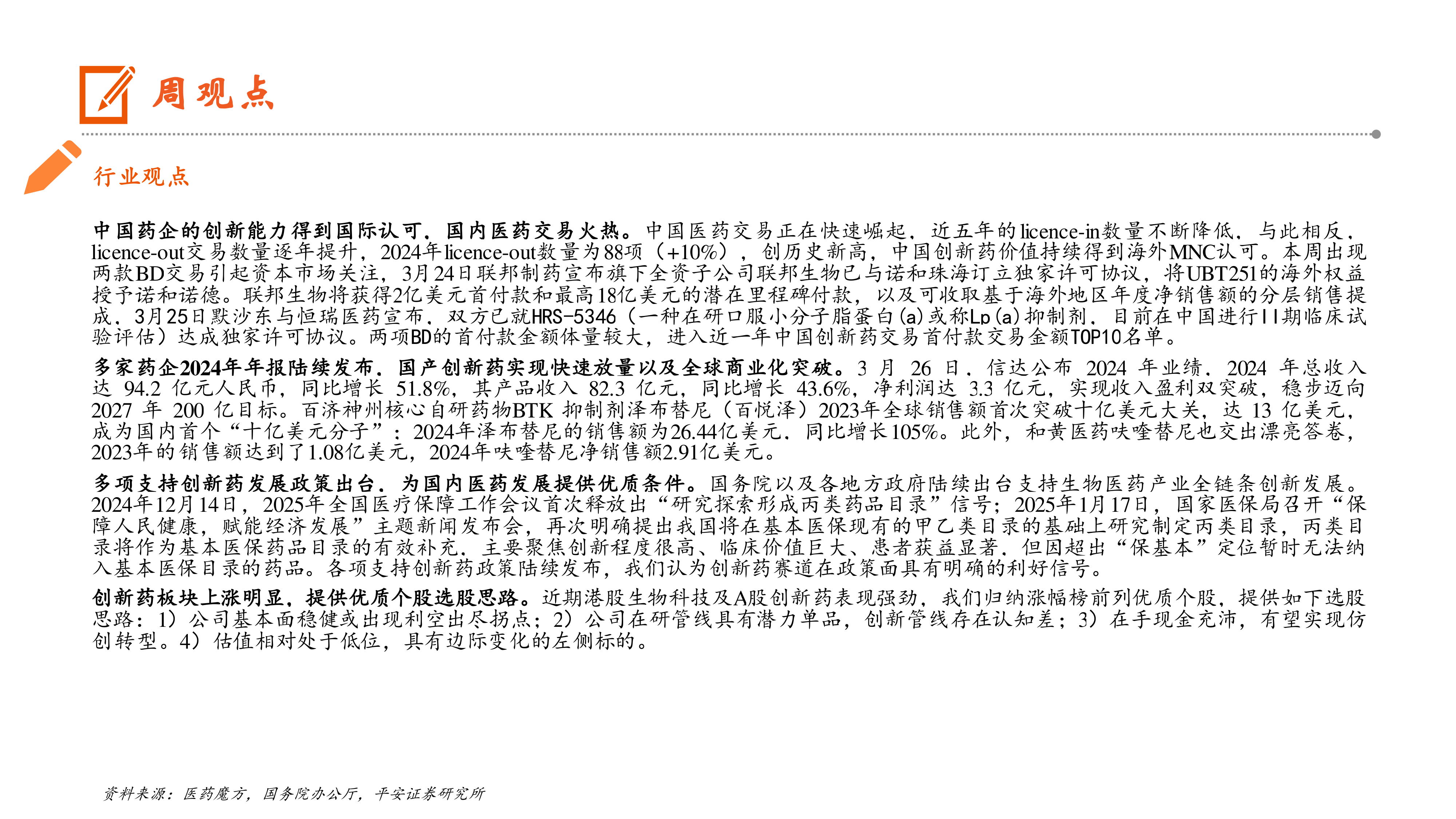 中国药企的创新能力得到国际认可,国内医药交易火热。中国医药交易正在快速崛起,近五年的licence-in数量不断降低,与此相反,licence-out交易数量逐年提升,2024年licence-out数量为88项(+10%),创历史新高,中国创新药价值持续得到海外MNC认可。本周出现两款BD交易引起资本市场关注,3月24日联邦制药宣布旗下全资子公司联邦生物已与诺和珠海订立独家许可协议,将UBT251的海外权益授予诺和诺德。联邦生物将获得2亿美元首付款和最高18亿美元的潜在里程碑付款,以及可收取基于海外地区年度净销售额的分层销售提成,3月25日默沙东与恒瑞医药宣布,双方已就HRS-5346(一种在研口服小分子脂蛋白(a)或称Lp(a)抑制剂,目前在中国进行II期临床试