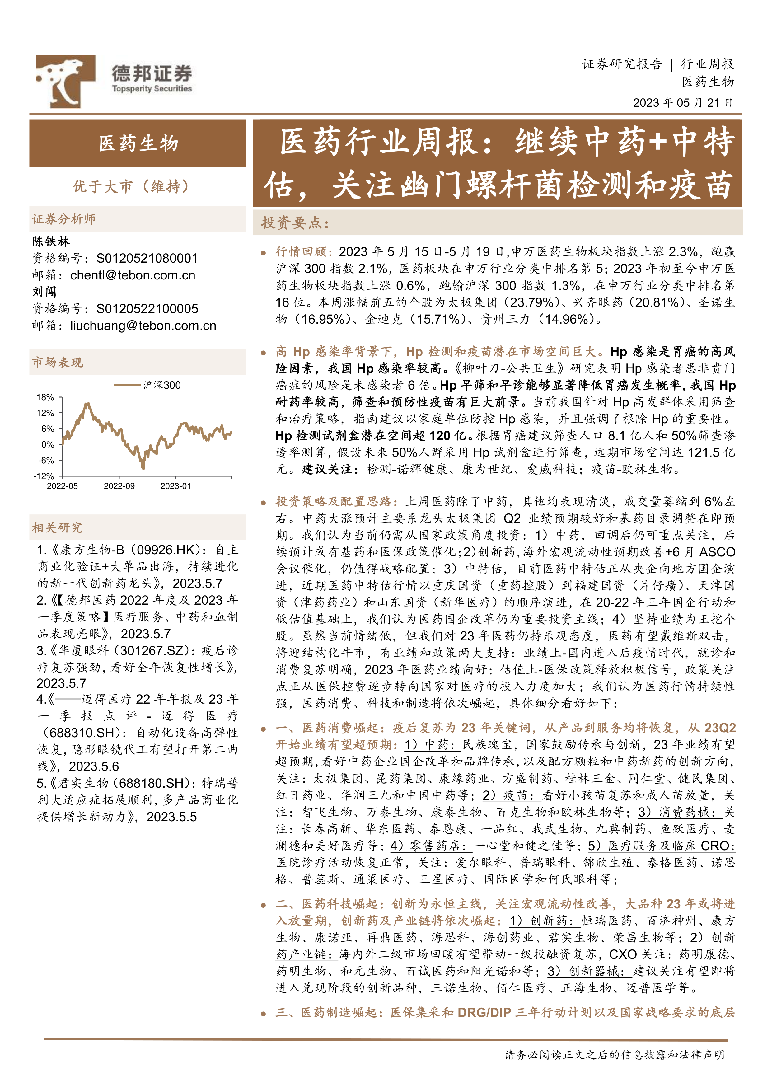 行情回顾:2023年5月15日-5月19日,申万医药生物板块指数上涨2.3%,跑赢沪深300指数2.1%,医药板块在申万行业分类中排名第5;2023年初至今申万医药生物板块指数上涨0.6%,跑输沪深300指数1.3%,在申万行业分类中排名第16位。本周涨幅前五的个股为太极集团(23.79%)、兴齐眼药(20.81%)、圣诺生物(16.95%)、金迪克(15.71%)、贵州三力(14.96%)。