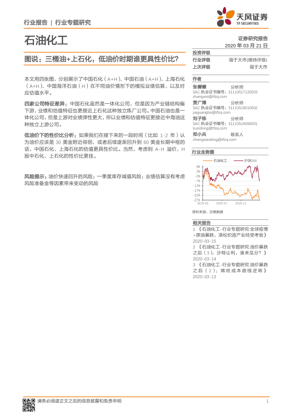 报告基于对未来1-2年油价走势的预测(30美元/桶附近或逐步回升至60美元/桶),对中国石化、中国石油、上海石化和中国海洋石油四家公司进行了业绩和估值模拟。模拟结果显示,在低油价环境下,中国石化和上海石化的估值相对更具吸引力。