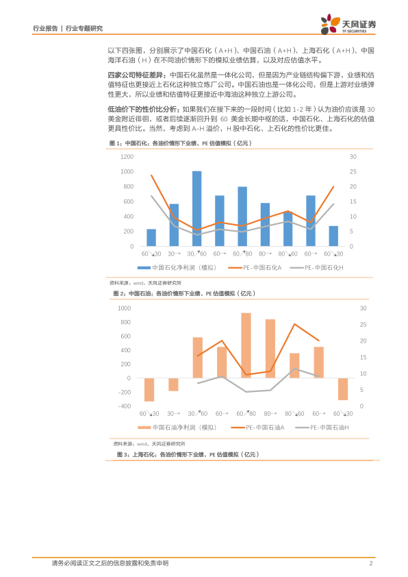 报告的核心内容是基于Wind数据,对中国石化(A+H)、中国石油(A+H)、上海石化(A+H)和中国海洋石油(H)四家公司在不同油价情景(60美元/桶下降至30美元/桶,30美元/桶维持,30美元/桶上升至60美元/桶等)下的净利润和市盈率(PE)进行了模拟,并以图表形式直观地展现了模拟结果。这些图表分别为:图1:中国石化业绩及PE估值模拟;图2:中国石油业绩及PE估值模拟;图3:上海石化业绩及PE估值模拟;图4:中国海洋石油业绩及PE估值模拟。