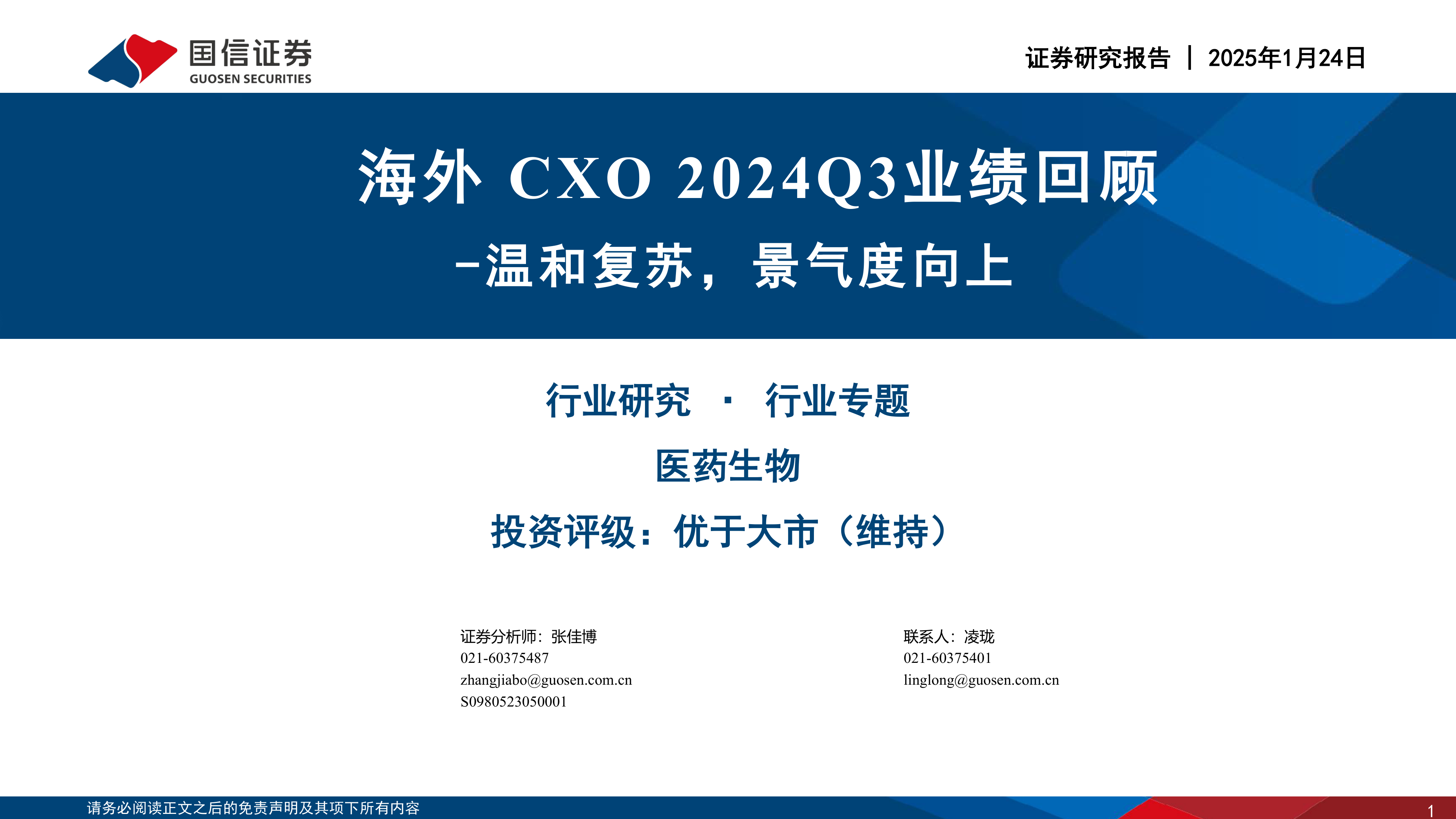 医药生物:海外CXO 2024Q3业绩回顾-温和复苏,景气度向上