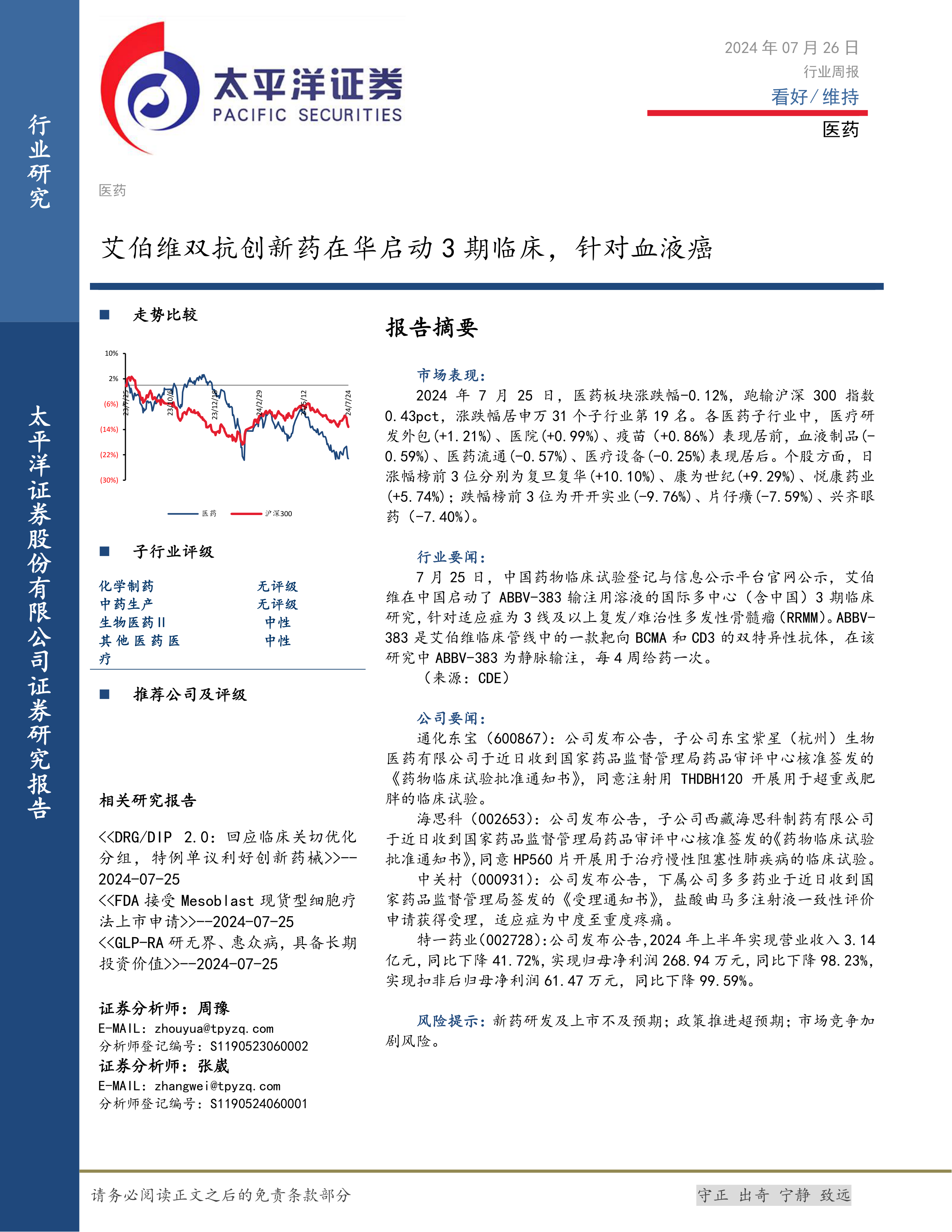 2024年7月25日,医药板块涨跌幅-0.12%,跑输沪深300指数0.43pct,涨跌幅居申万31个子行业第19名。各医药子行业中,医疗研发外包(+1.21%)、医院(+0.99%)、疫苗(+0.86%)表现居前,血液制品(-0.59%)、医药流通(-0.57%)、医疗设备(-0.25%)表现居后。个股方面,日涨幅榜前3位分别为复旦复华(+10.10%)、康为世纪(+9.29%)、悦康药业(+5.74%);跌幅榜前3位为开开实业(-9.76%)、片仔癀(-7.59%)、兴齐眼药(-7.40%)。