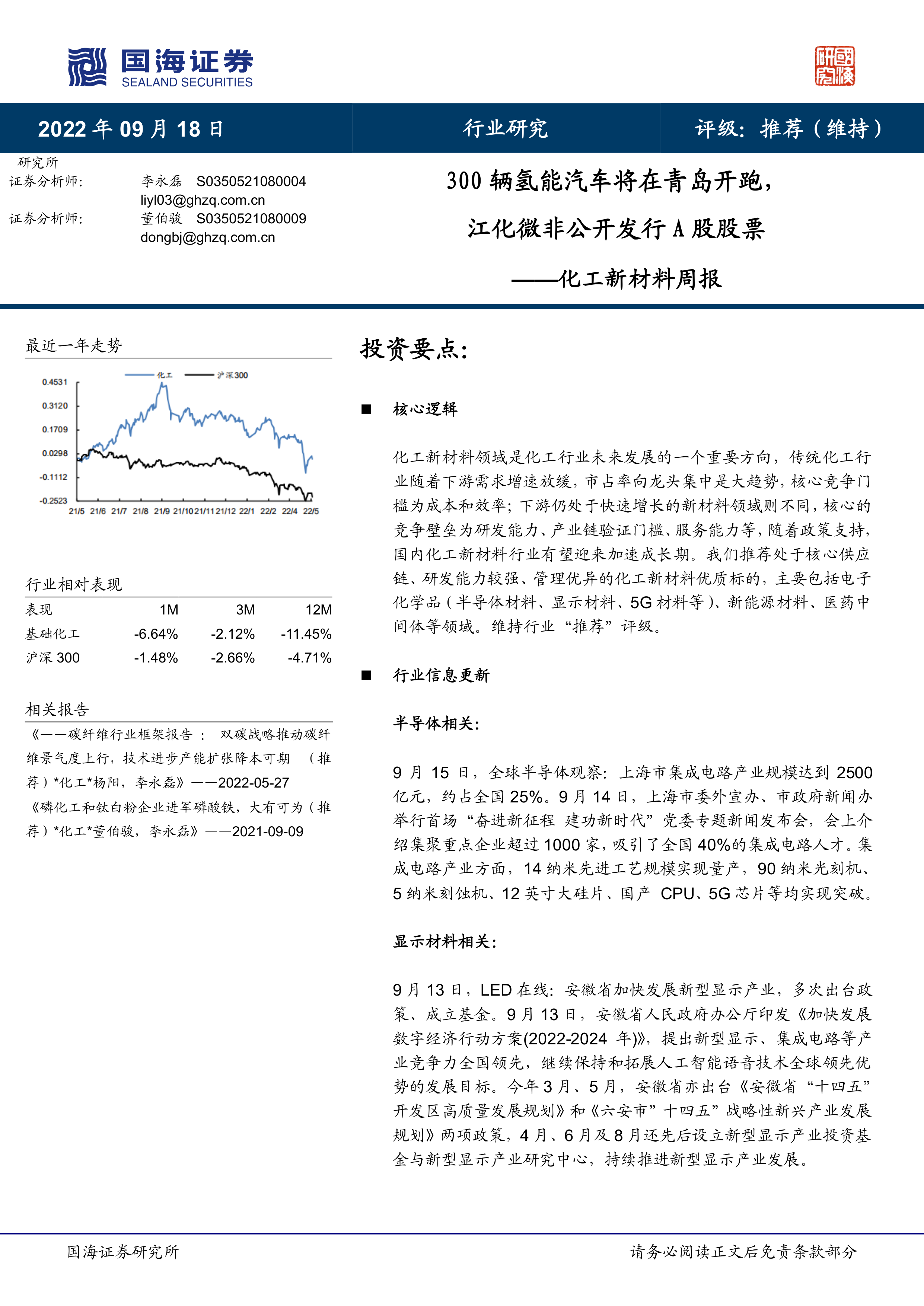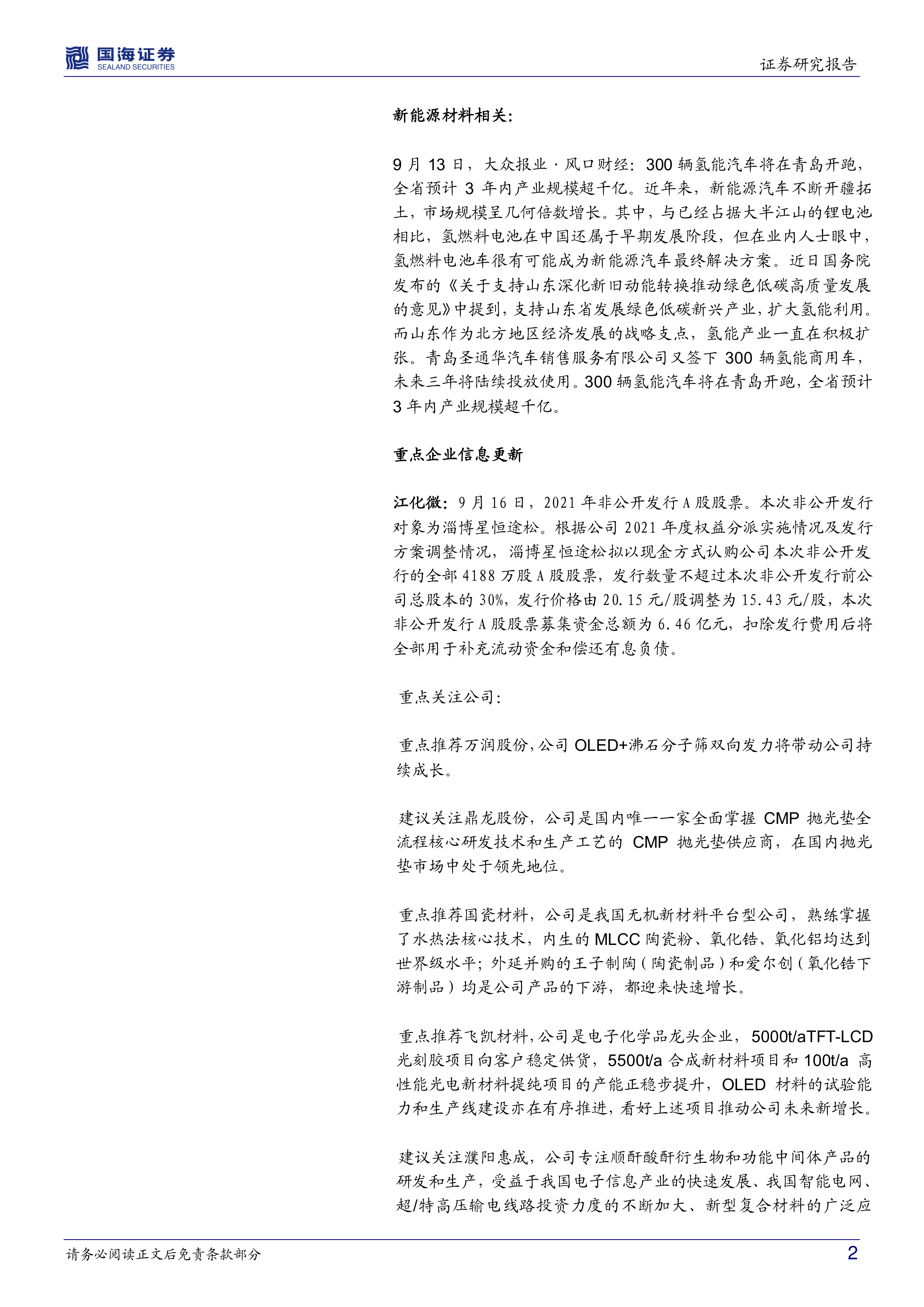 化工新材料周报:300辆氢能汽车将在青岛开跑,江化微非公开发行A股股票