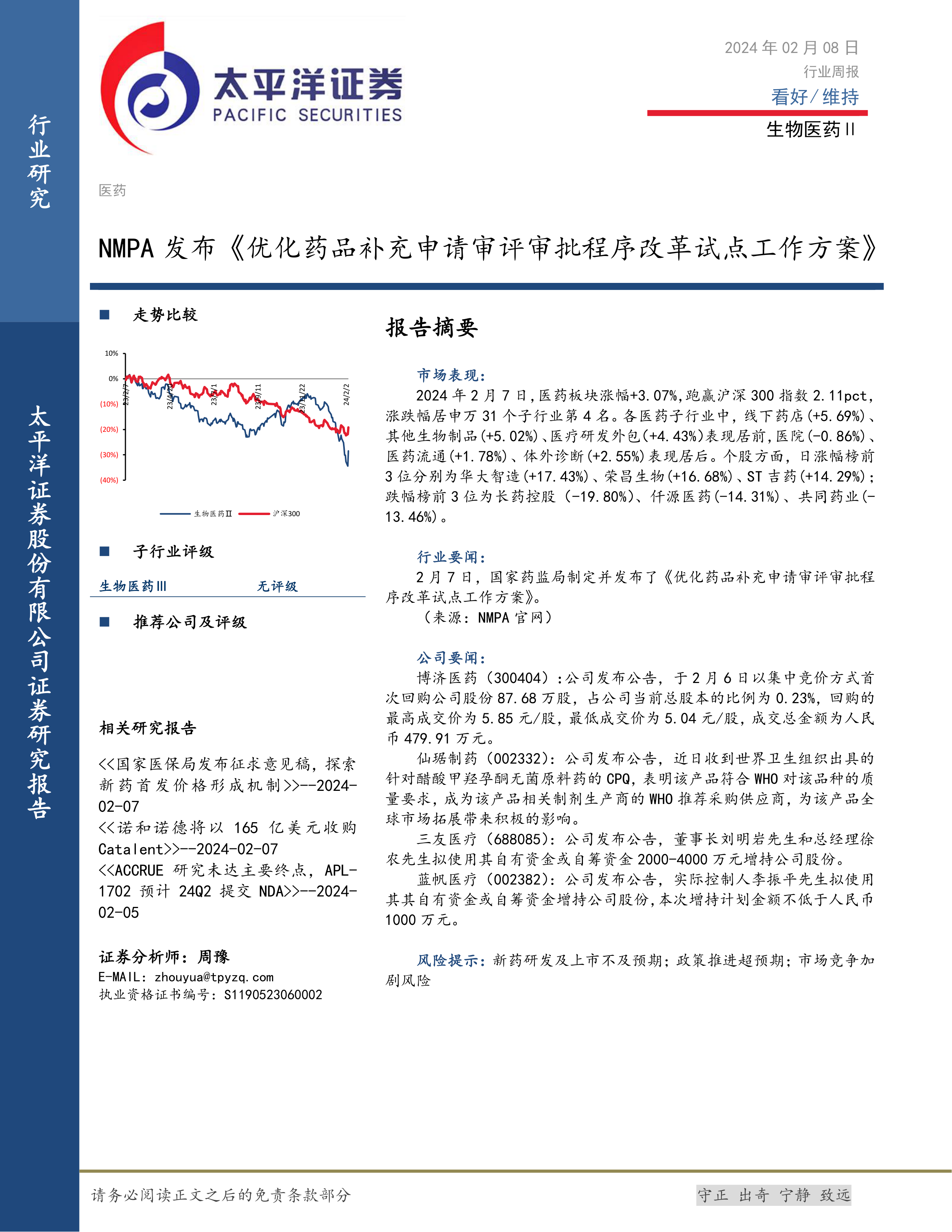报告中提到了多家公司的重要新闻,例如博济医药的股份回购、仙琚制药获得WHO推荐采购供应商资格、三友医疗和蓝帆医疗的增持计划等。这些信息反映了公司自身的经营状况和发展战略,投资者可以根据这些信息结合自身投资策略进行判断。 报告未提供具体的公司评级,仅提供了行业评级为“看好”。