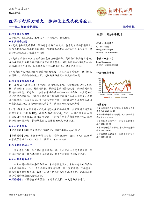 本报告基于2020年3月化工行业数据,分析了疫情对化工行业的影响,指出行业面临经济下行压力增大,整体需求承压,产品价格普遍回落。报告建议投资者选择具有护城河优势的行业龙头企业进行防御性投资,并重点关注部分供给端受疫情影响较大、需求端下滑较少的行业,例如维生素行业和钛白粉行业。报告还对部分重点公司和板块的异动进行了点评,并提供了行业估值水平、外资持仓变化以及化工产品价格动态等信息,为投资者提供参考。 需要注意的是,报告中提到的投资建议仅供参考,投资者应根据自身情况进行独立判断。