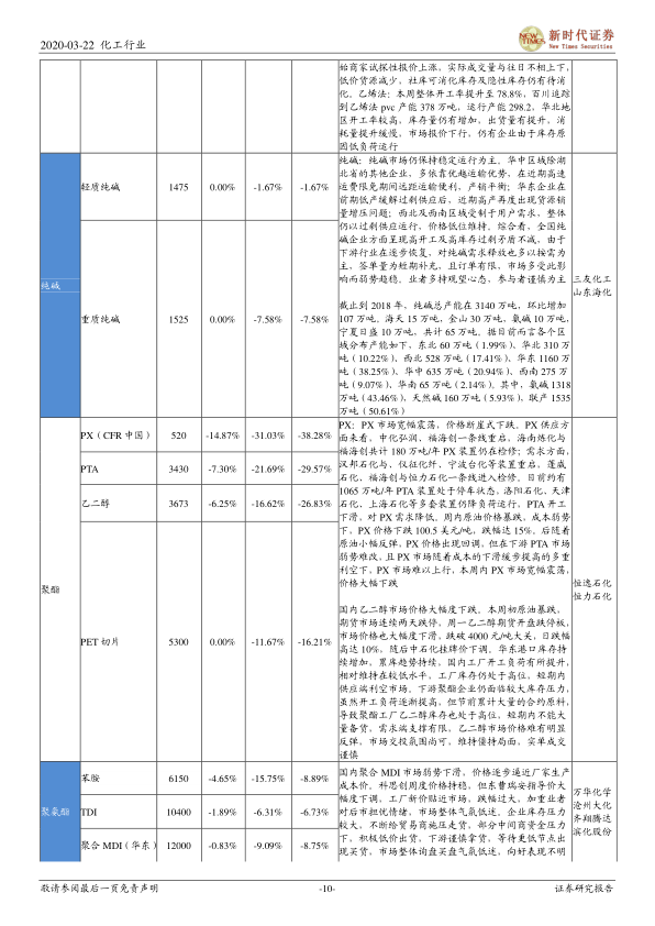 本报告的核心观点是:2020年3月,受疫情全球蔓延影响,化工行业面临经济下行压力增大,整体需求承压,化工产品价格普遍回落。报告建议投资者选择具有护城河优势的行业龙头企业进行防御性投资,并重点关注部分供给端受疫情影响较大、需求端下滑较少的行业,例如维生素行业。
