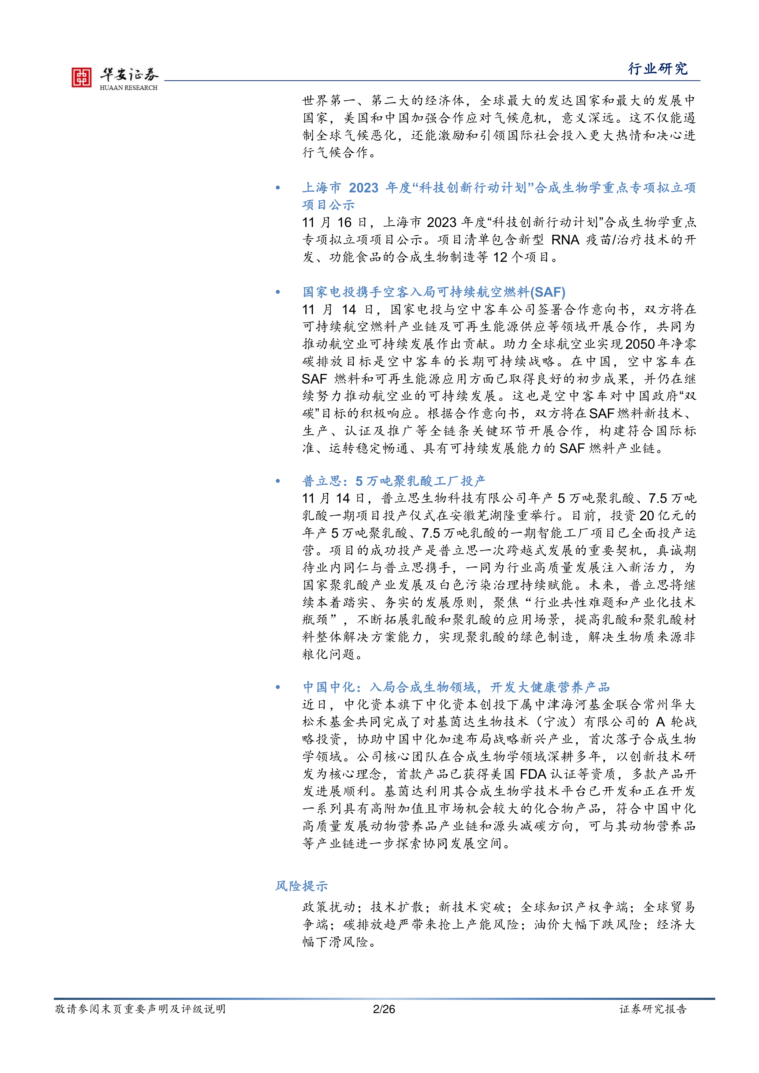 华安证券化工团队发表的《合成生物学周报》是一份面向一级市场、二级市场,汇总国内外合成生物学相关领域企业信息的行业周报。目前生命科学基础前沿研究持续活跃,生物技术革命浪潮席卷全球并加速融入经济社会发展,为人类应对生命健康、气候变化、资源能源安全、粮食安全等重大挑战提供了崭新的解决方案。国家发改委印发《“十四五”生物经济发展规划》,生物经济万亿赛道呼之欲出。