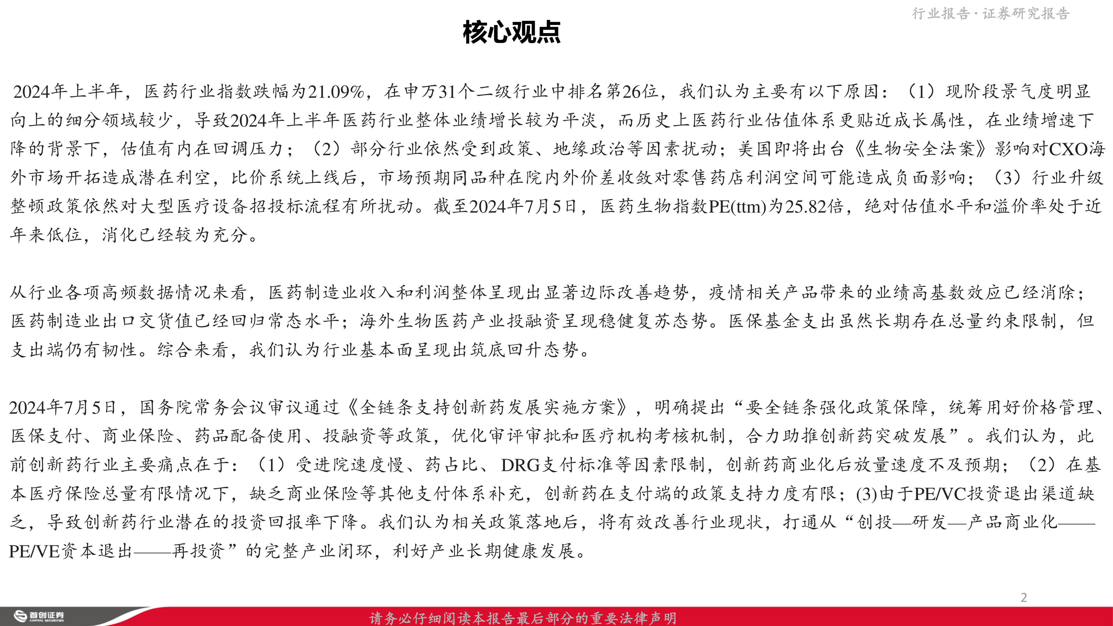 2024年上半年,医药行业整体表现低迷,但其下跌主要源于短期因素,而非长期基本面问题。行业估值已消化充分,部分细分领域和个股具备投资价值。