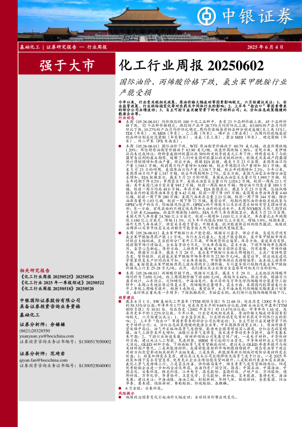 截至6月1日,SW基础化工市盈率(TTM剔除负值)为21.66倍,处在历史(2002年至今的58.33%分位数;市净率为1.77倍,处在历史水平的9.68%分位数。SW石油石化市盈率(TTM剔除负值)为10.81倍,处在历史(2002年至今)的13.47%分位数;市净率为1.16倍,处在历史水平的1.22%分位数。今年以来,行业受关税相关政策、原油价格大幅波动等因素影响较大,六月份建议关注:1、安全监管政策、行业供给端变化等对农药及中间体行业的影响;2、上半年“抢出口”等因素带来的部分公司业绩波动;3、自主可控日益关键背景下的电子材料公司;4、分红派息政策稳健的能源企业等。中长期推荐投资主线:1、原油价格有望延续中高位,油气开采板块高景气度持续,能源央企提质增效深入推进,分红派息政策稳健。油气上游资本开支增加,油服行业景气度修复,技术进步带动竞争力提升,海外发展未来可期;2、下游行业快速发展,新材料领域公司发展空间广阔。一是电子材料。半导体材料方面,建议关注人工智能、先进封装、HBM等引起的行业变化,半导体材料自主可控意义深远。OLED材料方面,下游面板景气度有望触底向好,建议关注OLED渗透率提升与相关材料国产替代。二是新能源材料。我国新能源材料市场规模持续提升,固态电池等下游应用新方向有望带动相关材料产业链发展。三是医药、新能源等新兴领域对吸附分离材料需求旺盛;3、政策加持需求复苏,建议关注龙头公司业绩弹性及高景气度子行业。一是2025年政策加持下需求有望复苏,优秀龙头企业业绩估值有望双提升。二是配额约束叠加需求提振氟化工景气度持续上行。三是需求改善,供给格局集中,维生素景气度有望维持高位。四是优秀轮胎企业进一步加码全球化布局,出海仍有广阔空间。推荐:中国石油、中国海油、中国石化、安集科技、雅克科技、江丰电子、鼎龙股份、蓝晓科技、沪硅产业、万润股份、德邦科技、万华化学、华鲁恒升、卫星化学、巨化股份、新和成、宝丰能源、莱特光电、海油发展;建议关注:中海油服、海油工程、彤程新材、华特气体、联瑞新材、圣泉集团、阳谷华泰、奥来德、瑞联新材、赛轮轮胎、玲珑轮胎、森麒麟。