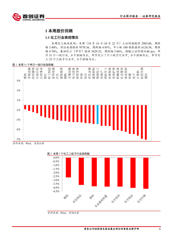 本周化工板块表现:本周(10月16日-10月22日)上证综指报收2983.06,周跌幅3.40%,深证成指报收9570.36,周跌幅4.95%,中小板100指数报收6124.58,周跌幅4.70%,基础化工(申万)报收3429.52,周跌幅3.86%,跑输上证综指0.46pct。申万31个一级行业,0个涨幅为正,申万化工7个二级子行业中,0个涨幅为正,申万化工23个三级子行业中,0个涨幅为正。本周化工行业407家上市公司中,有25家涨幅为正。涨幅居前的个股有华峰超纤、天晟新材、金力泰、恒天海龙、新纶新材、三维股份、建龙微纳、百龙创园、聚赛龙、高争民爆等。