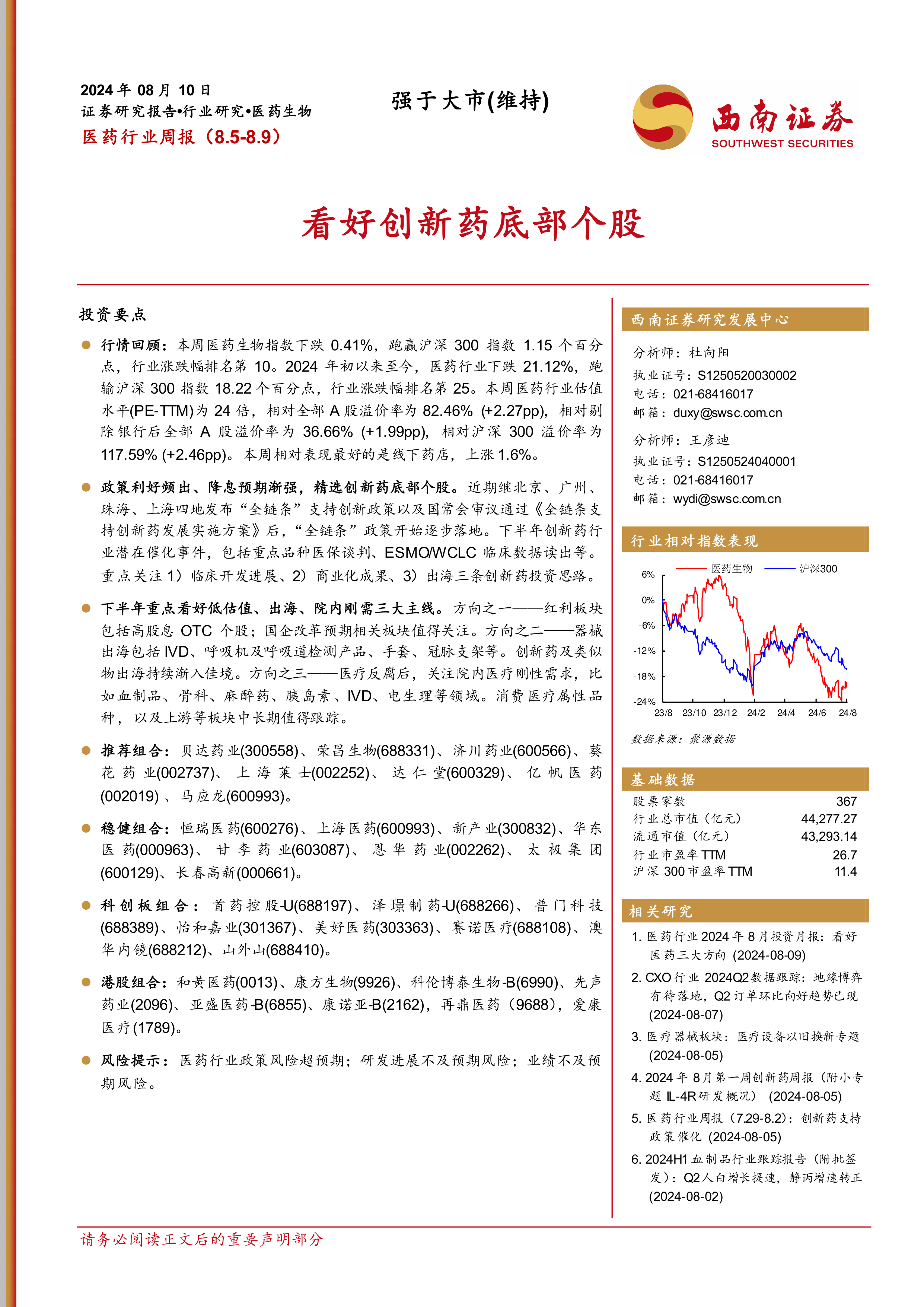本报告基于西南证券的研究数据,对医药行业近期表现、投资策略以及市场动态进行了专业、全面的分析。报告指出,尽管医药行业近期表现弱于大盘,但政策利好和降息预期为创新药底部个股提供了投资机会。报告建议投资者重点关注低估值、出海和院内刚需三大投资主线,并提供了具体的投资组合建议和风险提示。 报告还提供了大量的数据和图表,以及对近期行业新闻和政策的解读,为投资者提供了较为全面的信息参考。 然而,投资者仍需谨慎,并结合自身情况进行独立判断。