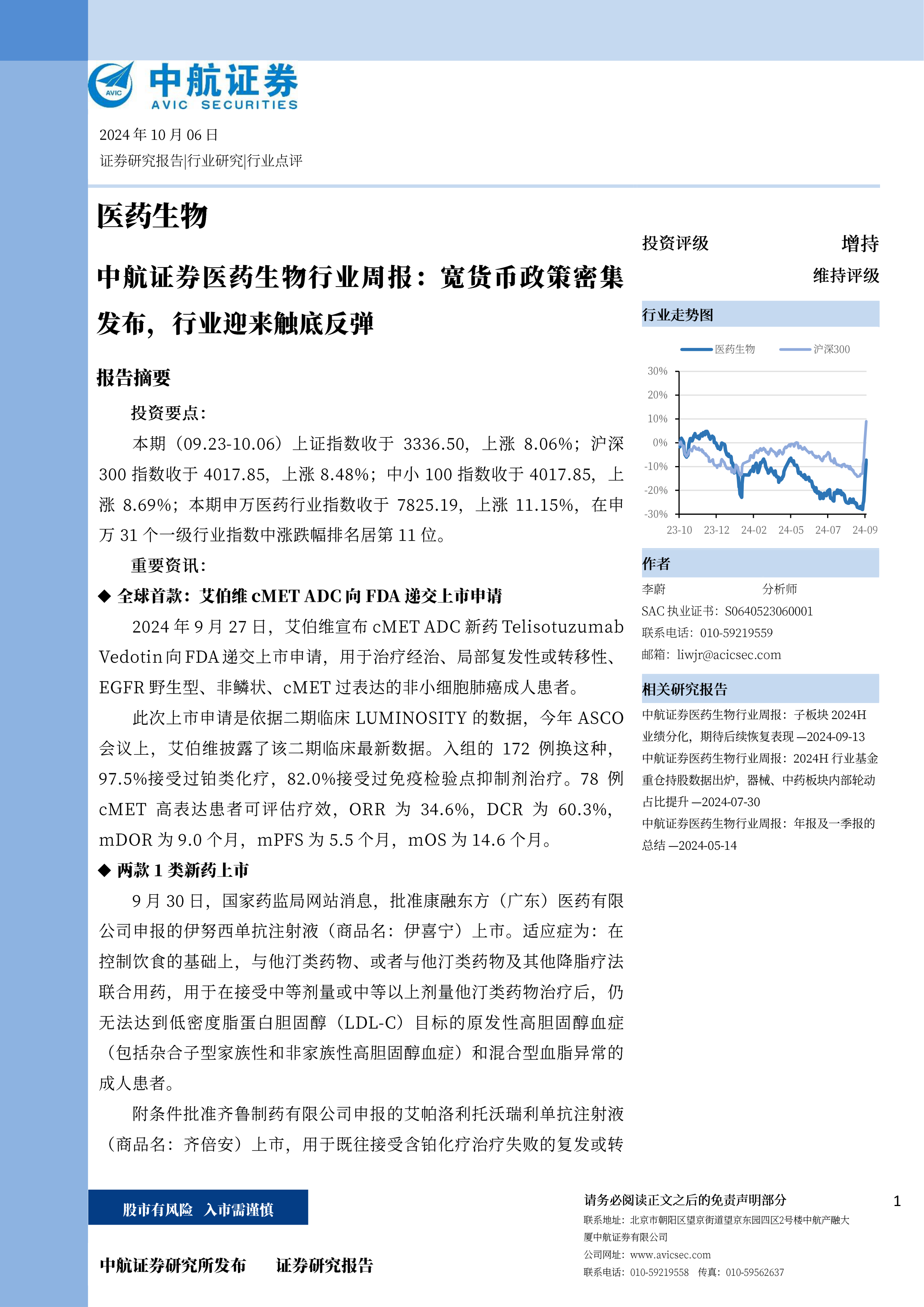 投资要点:本期(09.23-10.06)上证指数收于3336.50,上涨8.06%;沪深300指数收于4017.85,上涨8.48%;中小100指数收于4017.85,上涨8.69%;本期申万医药行业指数收于7825.19,上涨11.15%,在申万31个一级行业指数中涨跌幅排名居第11位。