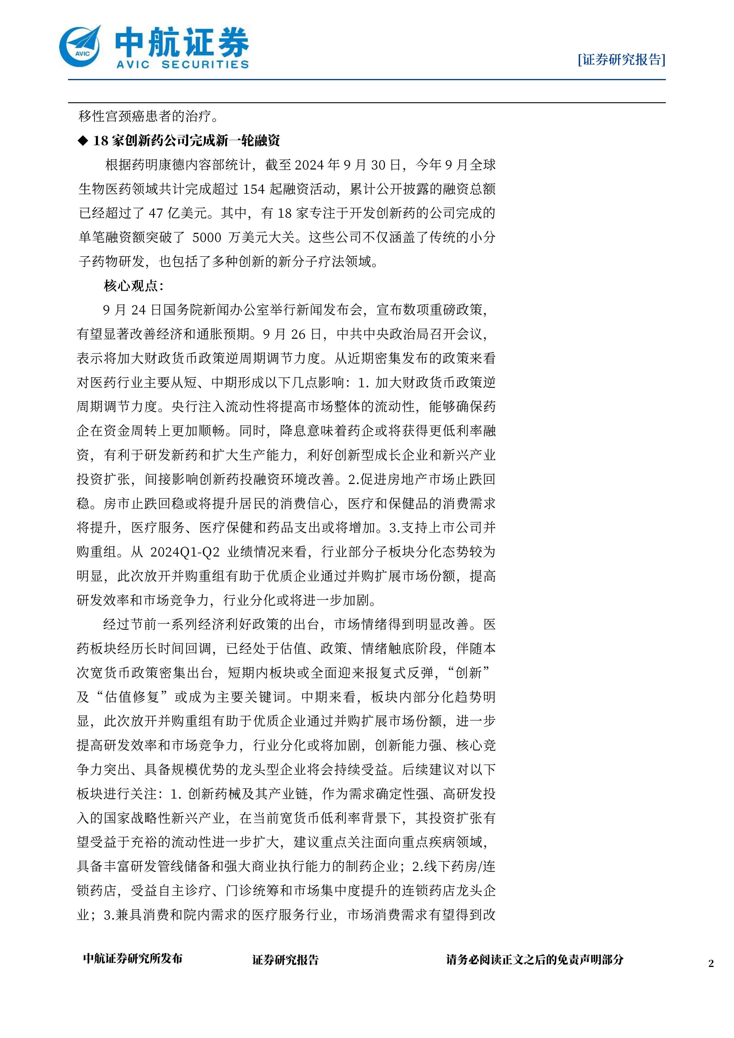经过节前一系列经济利好政策的出台,市场情绪得到明显改善。医药板块经历长时间回调,已经处于估值、政策、情绪触底阶段,伴随本次宽货币政策密集出台,短期内板块或全面迎来报复式反弹,“创新”及“估值修复”或成为主要关键词。中期来看,板块内部分化趋势明显,此次放开并购重组有助于优质企业通过并购扩展市场份额,进一步提高研发效率和市场竞争力,行业分化或将加剧,创新能力强、核心竞争力突出、具备规模优势的龙头型企业将会持续受益。后续建议对以下板块进行关注:1.创新药械及其产业链,作为需求确定性强、高研发投入的国家战略性新兴产业,在当前宽货币低利率背景下,其投资扩张有望受益于充裕的流动性进一步扩大,建议重点关注面向重点疾病领域,具备丰富研发管线储备和强大商业执行能力的制药企业;2.线下药房/连锁药店,受益自主诊疗、门诊统筹和市场集中度提升的连锁药店龙头企业;3.兼具消费和院内需求的医疗服务行业,市场消费需求有望得到改AVIC
