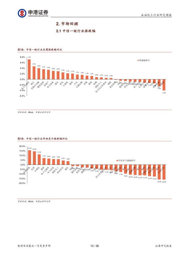 本节回顾了报告发布当周及年初至今中信石油石化指数、一级行业、三级行业以及成分股的涨跌幅情况。数据显示,本周中信石油石化指数下跌1.2%,各子行业表现也较为分化,个股涨跌幅差距较大。
