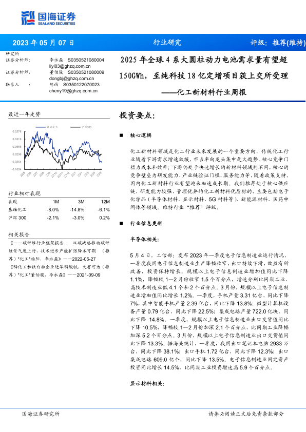 报告对半导体、显示和新能源材料等领域的行业信息、公司信息和产业数据进行了更新,并对部分重点公司进行了详细的分析。