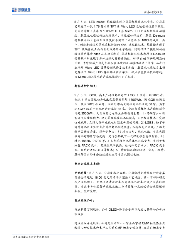 行业信息: 报告介绍了OLED利用磁共振绘制磁场的新技术以及维信诺参股公司成都辰显光电成功开发国内首款点亮率为100%的TFT基Micro LED无边框拼接显示模组等行业动态。