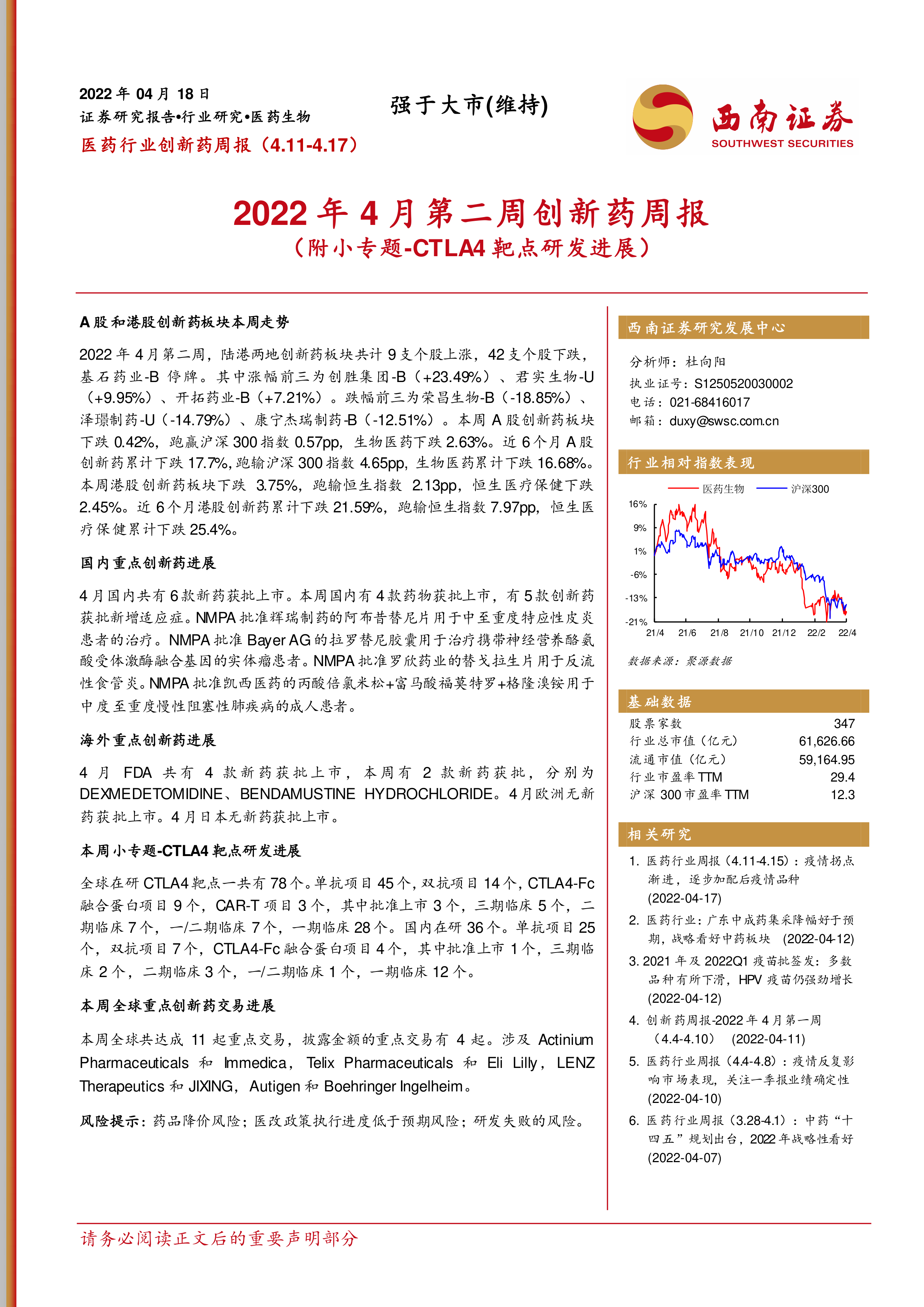 本报告的核心观点是:2022年4月11日至17日,陆港两地创新药板块表现分化,A股跑赢沪深300指数,而港股跑输恒生指数。国内外创新药研发进展活跃,多个新药获批上市或进入临床试验阶段,CTLA4靶点研发也取得一定进展。同时,本周全球创新药交易活跃,多起重要交易达成。
