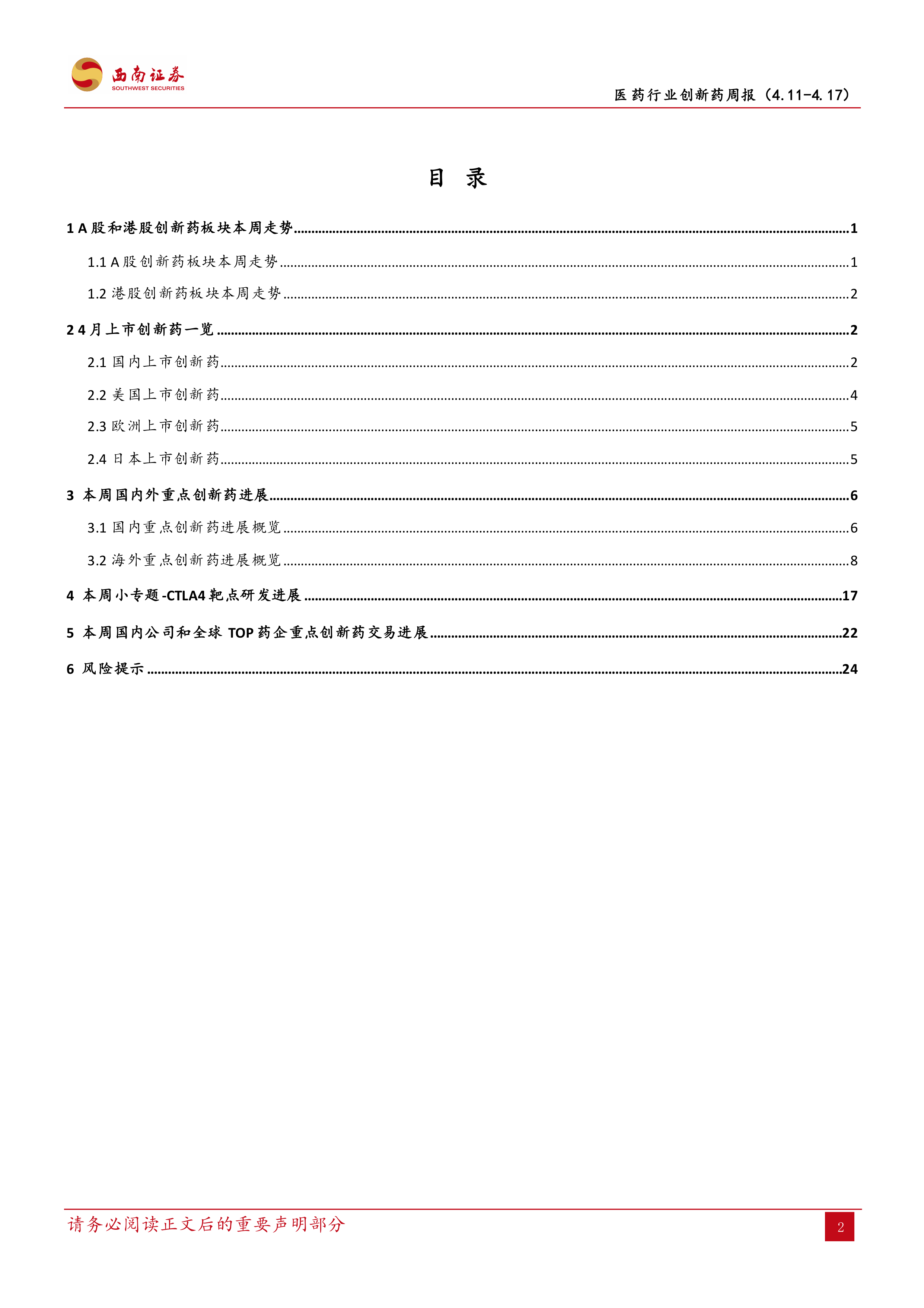 本报告基于公开数据,对2022年4月11日至17日陆港两地创新药市场表现、国内外创新药研发进展以及全球创新药交易动态进行了专业、全面的分析。报告显示,A股创新药板块短期表现优于大盘,但长期表现仍需关注;港股创新药板块持续低迷。国内外创新药研发持续活跃,CTLA4靶点研发进展值得关注。全球创新药交易活跃,多起重大交易达成,预示着市场竞争日益激烈。投资者需密切关注市场动态,谨慎投资。 报告中存在的风险提示也提醒投资者注意药品降价、医改政策以及研发失败等潜在风险。