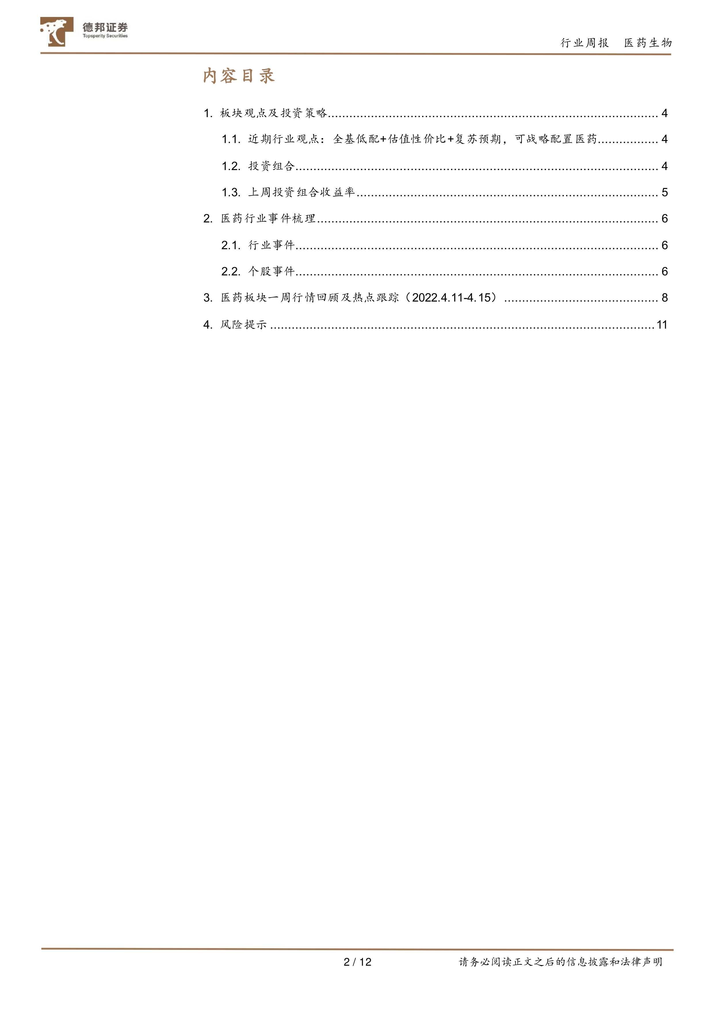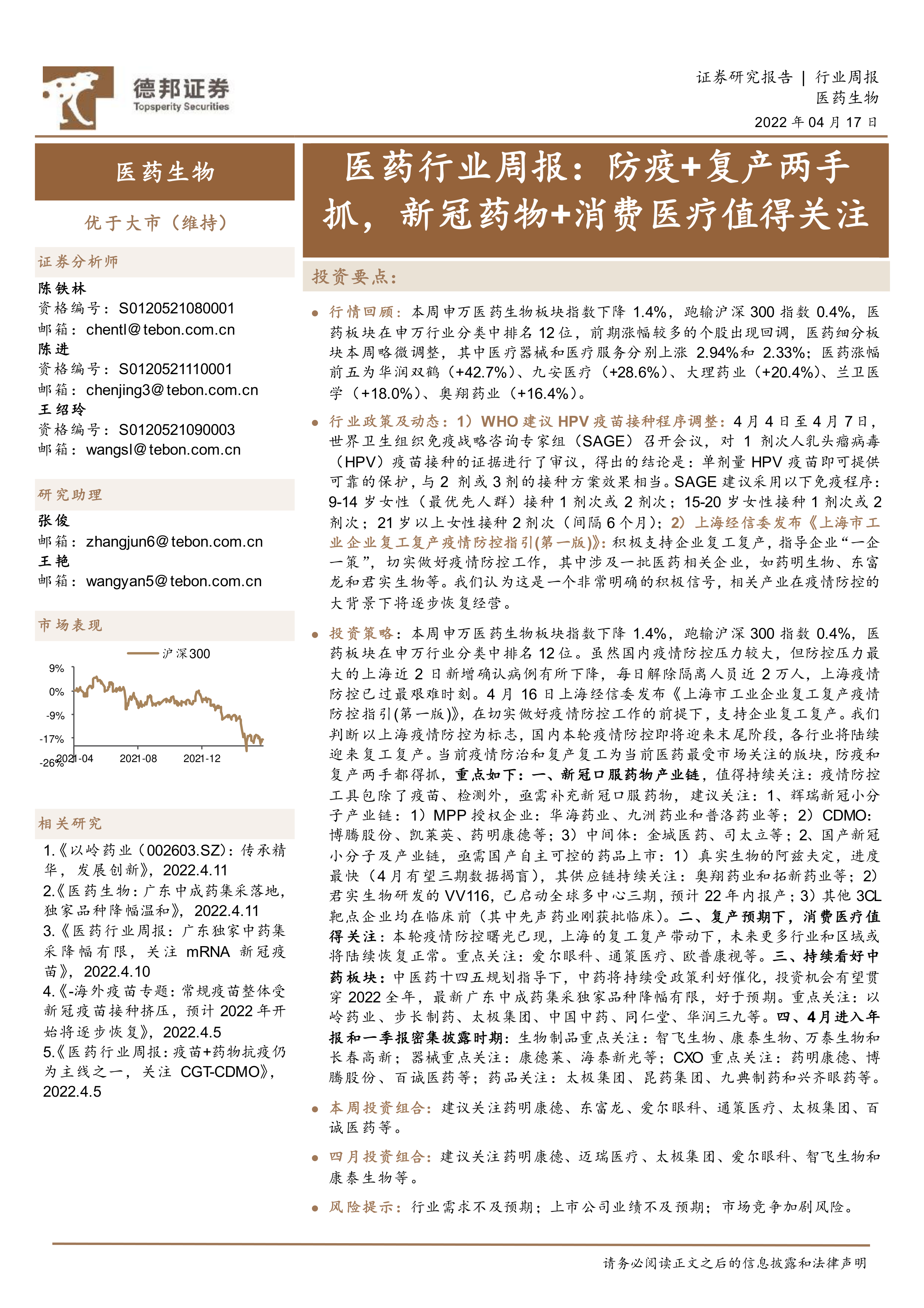 投资策略:本周申万医药生物板块指数下降1.4%,跑输沪深300指数0.4%,医药板块在申万行业分类中排名12位。虽然国内疫情防控压力较大,但防控压力最大的上海近2日新增确认病例有所下降,每日解除隔离人员近2万人,上海疫情防控已过最艰难时刻。4月16日上海经信委发布《上海市工业企业复工复产疫情防控指引(第一版)》,在切实做好疫情防控工作的前提下,支持企业复工复产。我们判断以上海疫情防控为标志,国内本轮疫情防控即将迎来末尾阶段,各行业将陆续迎来复工复产。当前疫情防治和复产复工为当前医药最受市场关注的版块,防疫和复产两手都得抓,重点如下:一、新冠口服药物产业链,值得持续关注:疫情防控工具包除了疫苗、检测外,亟需补充新冠口服药物,建议关注:1、辉瑞新冠小分子产业链:1)MPP授权企业:华海药业、九洲药业和普洛药业等;2)CDMO:博腾股份、凯莱英、药明康德等;3)中间体:金城医药、司太立等;2、国产新冠小分子及产业链,亟需国产自主可控的药品上市:1)真实生物的阿兹夫定,进度最快(4月有望三期数据揭盲),其供应链持续关注:奥翔药业和拓新药业等;2)君实生物研发的VV116,已启动全球多中心三期,预计22年内报产;3)其他3CL靶点企业均在临床前(其中先声药业刚获批临床)。二、复产预期下,消费医疗值得关注:本轮疫情防控曙光已现,上海的复工复产带动下,未来更多行业和区域或将陆续恢复正常。重点关注:爱尔眼科、通策医疗、欧普康视等。三、持续看好中药板块:中医药十四五规划指导下,中药将持续受政策利好催化,投资机会有望贯穿2022全年,最新广东中成药集采独家品种降幅有限,好于预期。重点关注:以岭药业、步长制药、太极集团、中国中药、同仁堂、华润三九等。四、4月进入年报和一季报密集披露时期:生物制品重点关注:智飞生物、康泰生物、万泰生物和长春高新;器械重点关注:康德莱、海泰新光等;CXO重点关注:药明康德、博腾股份、百诚医药等;药品关注:太极集团、昆药集团、九典制药和兴齐眼药等。