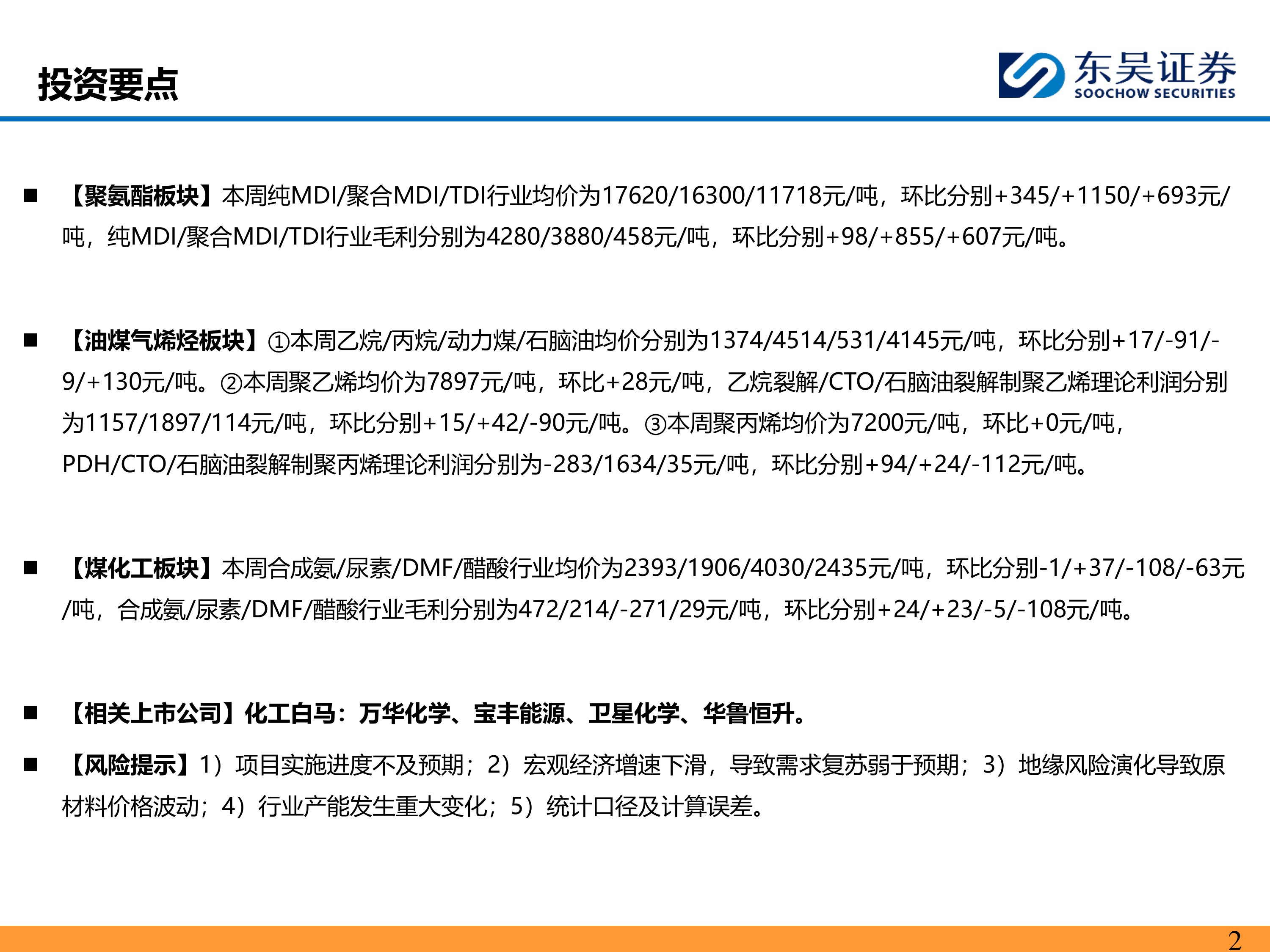 本周聚氨酯板块纯MDI、聚合MDI和TDI价格均上涨,且毛利也显著提高,显示出该板块的强劲增长势头。