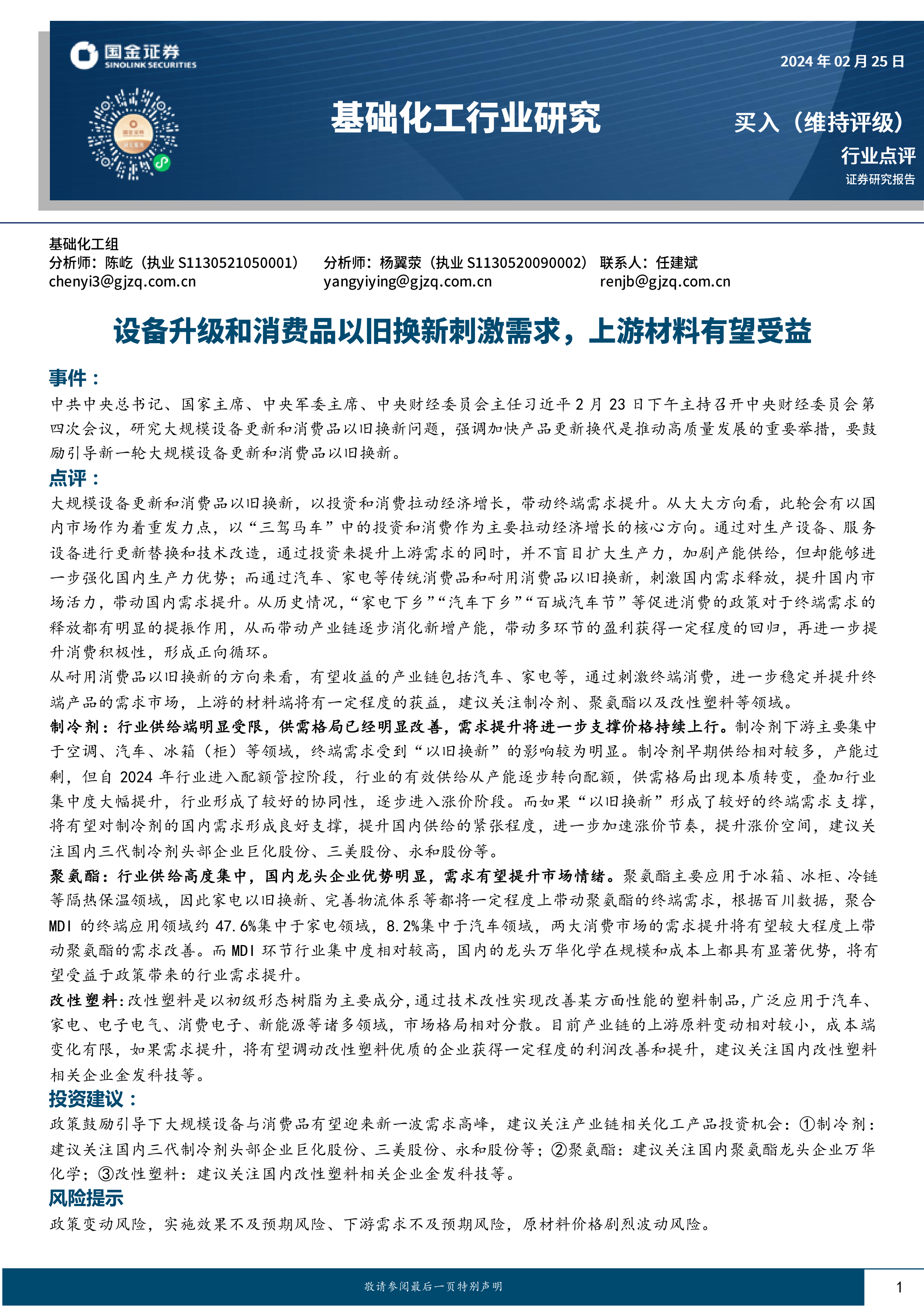 基础化工行业研究:设备升级和消费品以旧换新刺激需求,上游材料有望受益