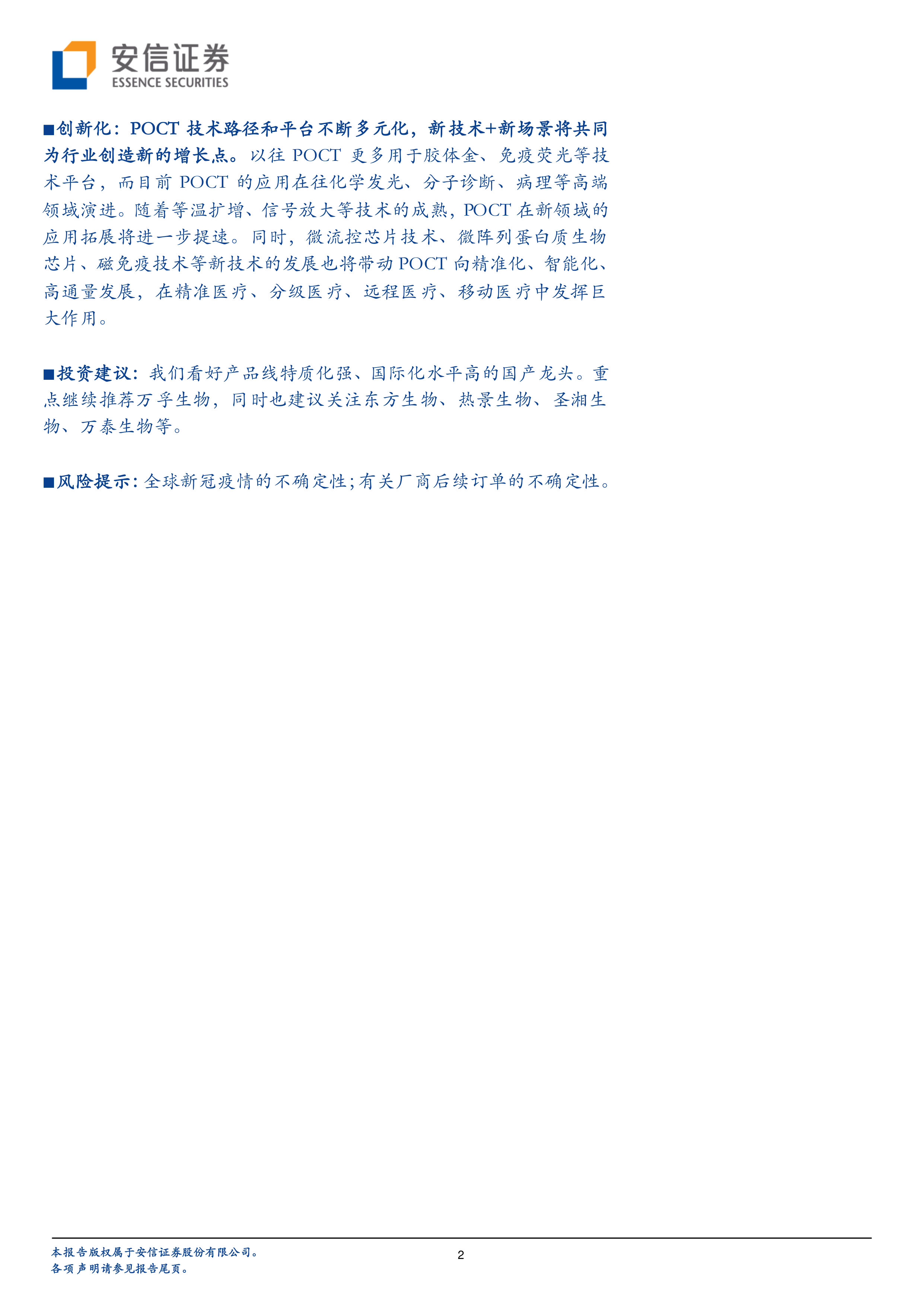 投资建议:我们看好产品线特质化强、国际化水平高的国产龙头。重点继续推荐万孚生物,同时也建议关注东方生物、热景生物、圣湘生物、万泰生物等。