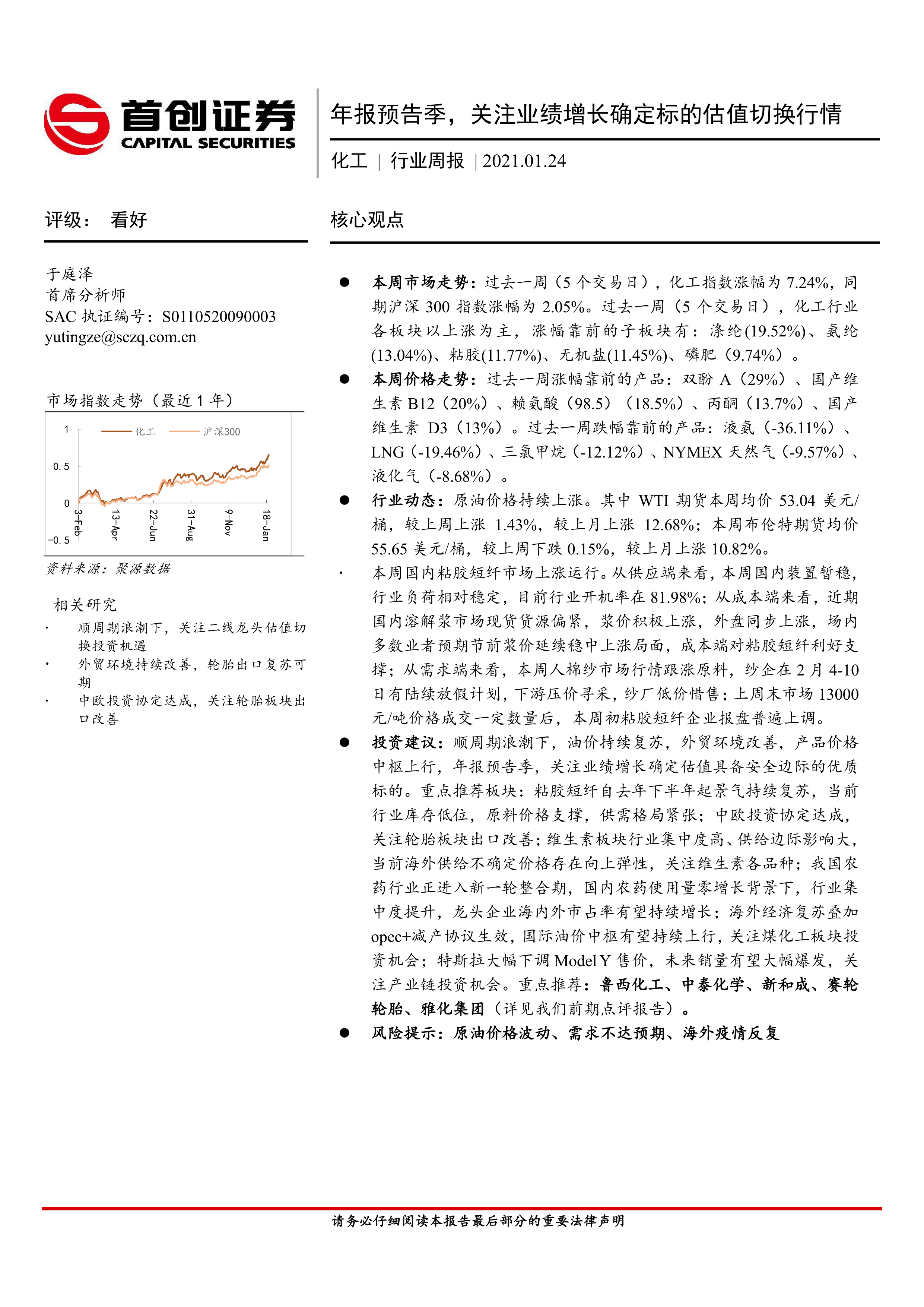 投资建议: 顺周期浪潮下,油价持续复苏,外贸环境改善,产品价格中枢上行,年报预告季,关注业绩增长确定估值具备安全边际的优质标的。重点推荐板块: 粘胶短纤自去年下半年起景气持续复苏,当前行业库存低位,原料价格支撑,供需格局紧张; 中欧投资协定达成,关注轮胎板块出口改善; 维生素板块行业集中度高、供给边际影响大,当前海外供给不确定价格存在向上弹性,关注维生素各品种; 我国农药行业正进入新一轮整合期,国内农药使用量零增长背景下,行业集中度提升,龙头企业海内外市占率有望持续增长;海外经济复苏叠加opec+减产协议生效,国际油价中枢有望持续上行,关注煤化工板块投资机会;特斯拉大幅下调 Model Y 售价,未来销量有望大幅爆发,关注产业链投资机会。 重点推荐:鲁西化工、中泰化学、新和成、赛轮轮胎、雅化集团(详见我们前期点评报告) 。