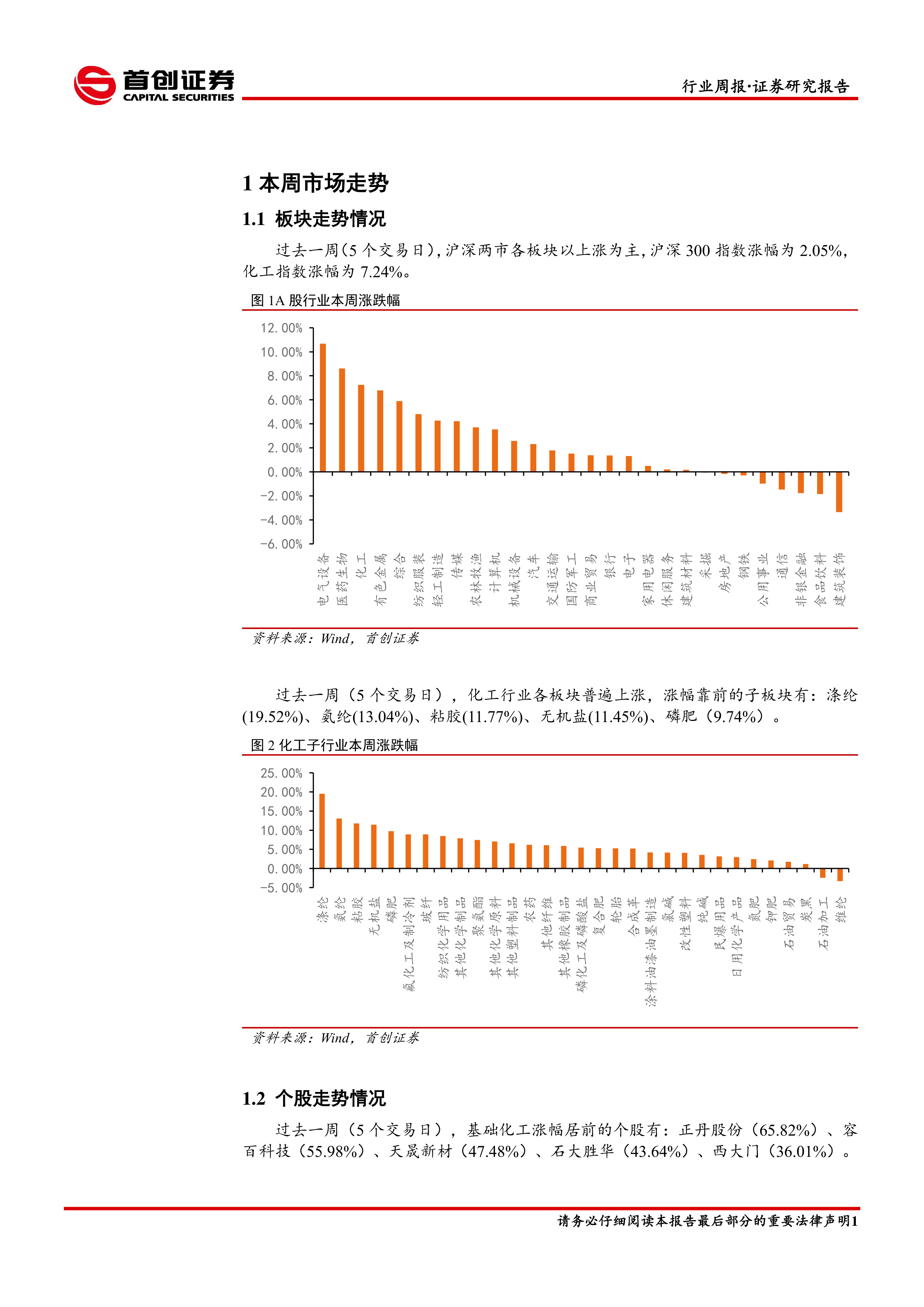 本报告首先对过去一周的市场走势进行了总结。化工指数涨幅为7.24%,显著高于同期沪深300指数的2.05%涨幅。化工行业各板块普遍上涨,涨幅靠前的子板块包括涤纶、氨纶、粘胶、无机盐和磷肥。 报告还分析了部分个股的涨跌幅情况,基础化工板块涨幅居前的个股有正丹股份、容百科技等,跌幅居前的个股有ST昌九、ST亚星等。
