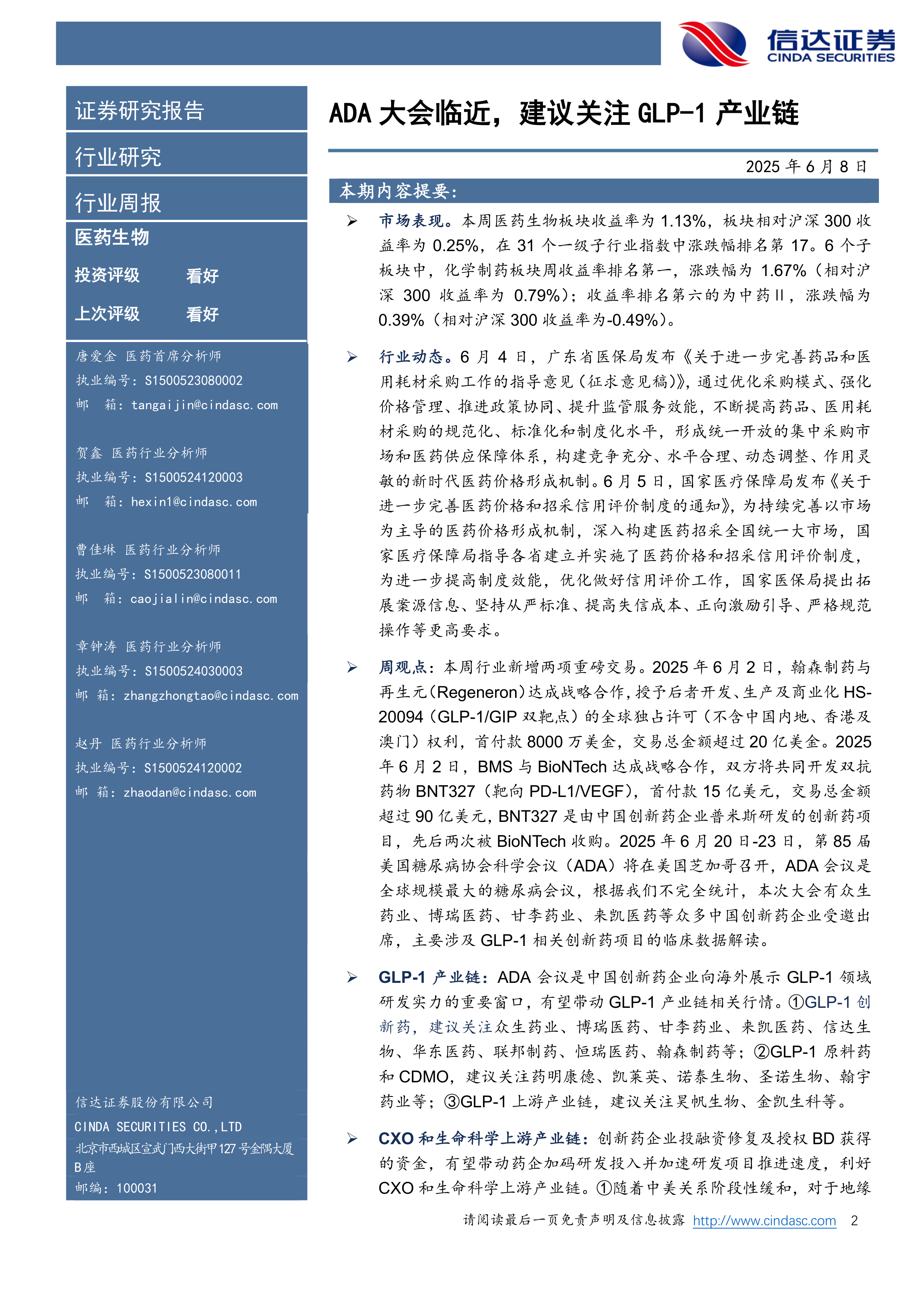 本报告基于对近期医药行业市场表现、政策动态、重大交易以及ADA大会的分析,认为GLP-1产业链以及CXO、生命科学上游产业链等领域存在较好的投资机会。 报告提供了具体的投资建议,并提示了关税政策变动、地缘政治风险、消费刺激政策变动、产品销售不及预期、临床数据不及预期、集采降价幅度高于预期以及市场竞争加剧等风险因素。 投资者应根据自身情况谨慎投资,并注意风险管理。