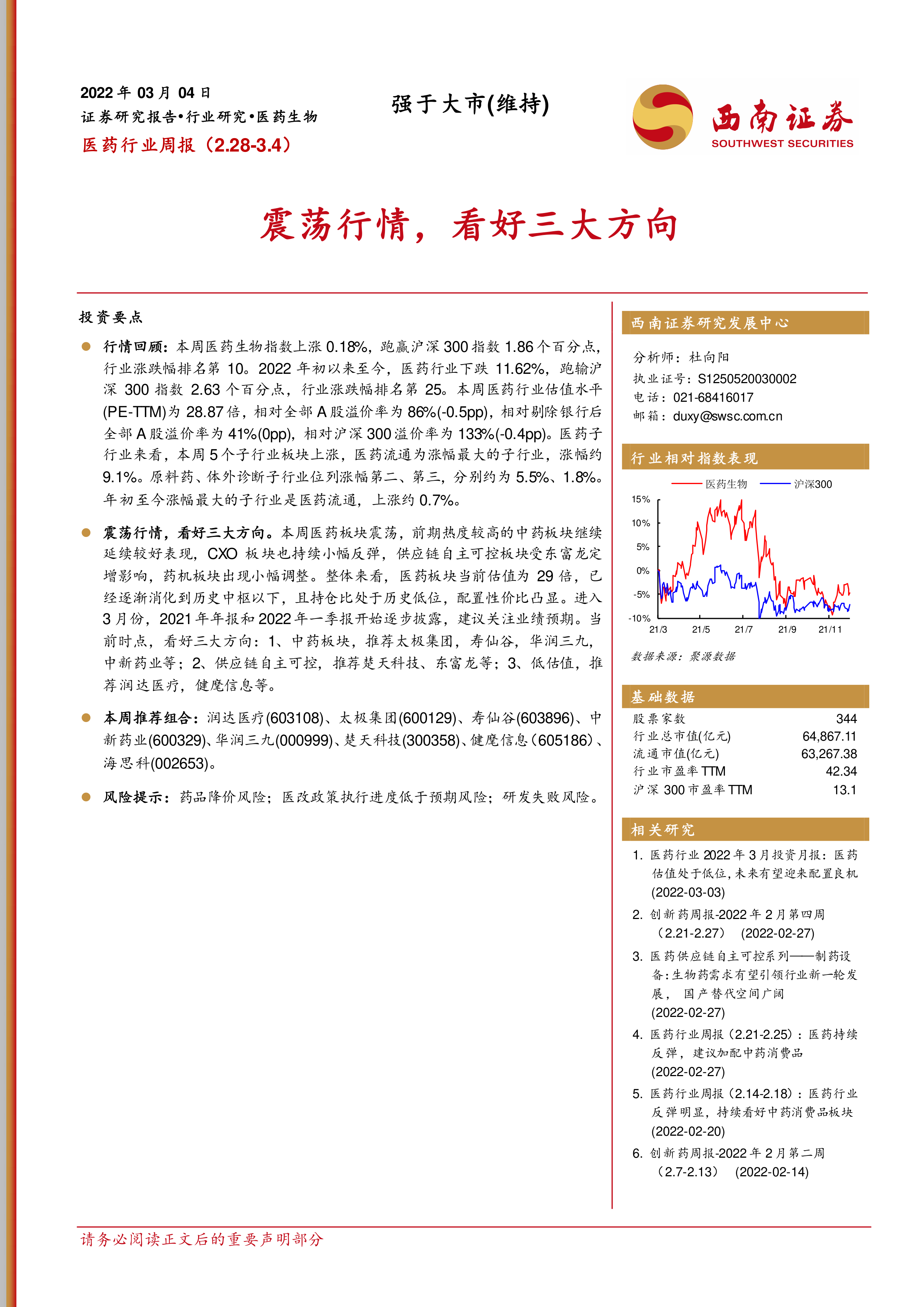 本报告对2022年3月4日当周医药行业进行了全面分析,涵盖了市场行情、投资策略、重点个股推荐、新冠疫情进展、政策新闻以及公司基本面等多个方面。 报告认为,尽管医药板块短期内存在震荡,但其估值已处于历史低位,配置性价比凸显。 报告看好中药、供应链自主可控和低估值三大方向,并推荐了相应的个股组合,为投资者提供了有价值的投资参考。 然而,投资者仍需关注药品降价、医改政策和研发失败等风险。