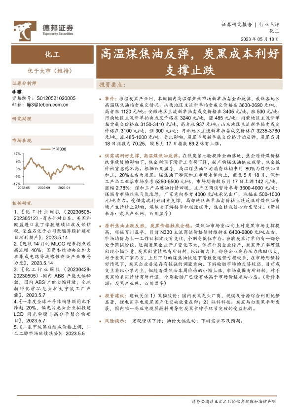 事件:根据炭黑产业网,本周国内高温煤焦油市场新单拍卖全面反弹,最新各地区高温煤焦油拍卖成交情况:山西地区主流新单拍卖成交价格在3630-3690元/吨,高者涨1120元/吨;安徽地区主流新单拍卖成交价格在3405元/吨,涨530元/吨;河南地区主流新单拍卖成交价格在3240元/吨,涨485元/吨;内蒙地区主流新单拍卖成交价格在3150-3410元/吨,高者涨937元/吨;山东地区主流新单拍卖成交价格在3100元/吨,涨300元/吨;河北地区主流新单拍卖成交价格在3235-3780元/吨,涨485-1000元/吨。受此影响,炭黑市场新单成交价格开始反弹,炭黑5月18日指数为70.25,较5月17日指数69.2略有上涨。