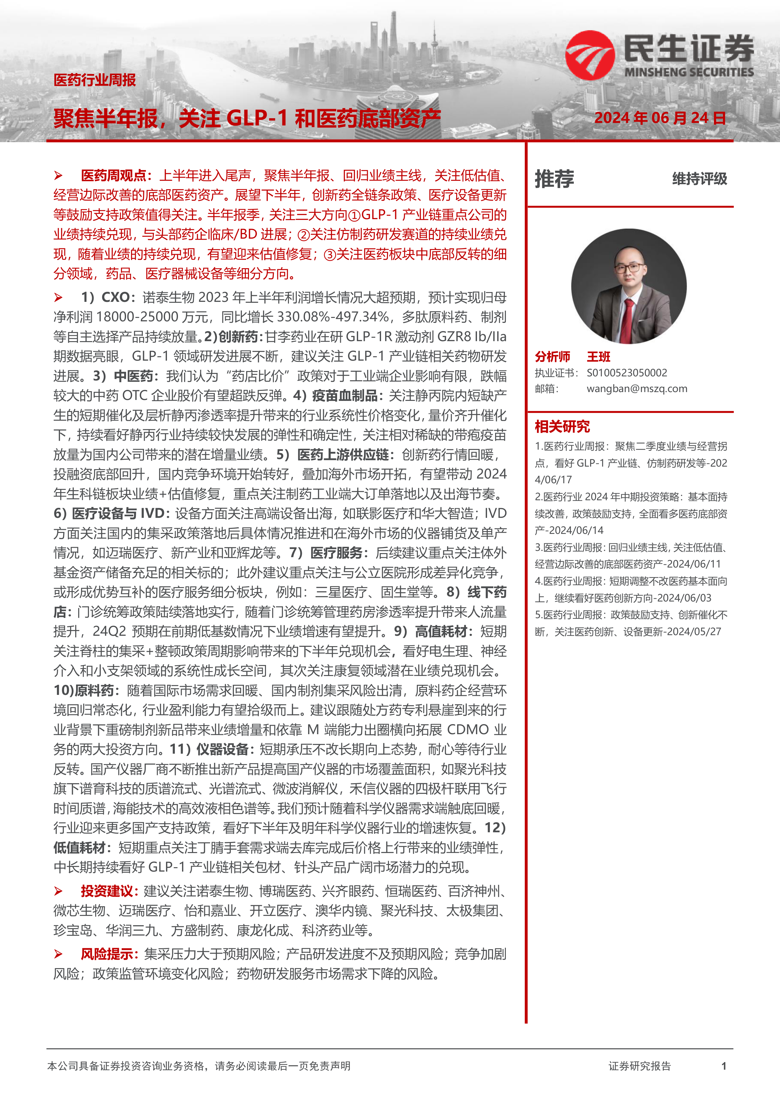 10)原料药:随着国际市场需求回暖、国内制剂集采风险出清,原料药企经营环境回归常态化,行业盈利能力有望拾级而上。建议跟随处方药专利悬崖到来的行业背景下重磅制剂新品带来业绩增量和依靠M端能力出圈横向拓展CDMO业务的两大投资方向。11)仪器设备:短期承压不改长期向上态势,耐心等待行业反转。国产仪器厂商不断推出新产品提高国产仪器的市场覆盖面积,如聚光科技旗下谱育科技的质谱流式、光谱流式、微波消解仪,禾信仪器的四极杆联用飞行时间质谱,海能技术的高效液相色谱等。我们预计随着科学仪器需求端触底回暖,行业迎来更多国产支持政策,看好下半年及明年科学仪器行业的增速恢复。12)低值耗材:短期重点关注丁腈手套需求端去库完成后价格上行带来的业绩弹性,中长期持续看好GLP-1产业链相关包材、针头产品广阔市场潜力的兑现。