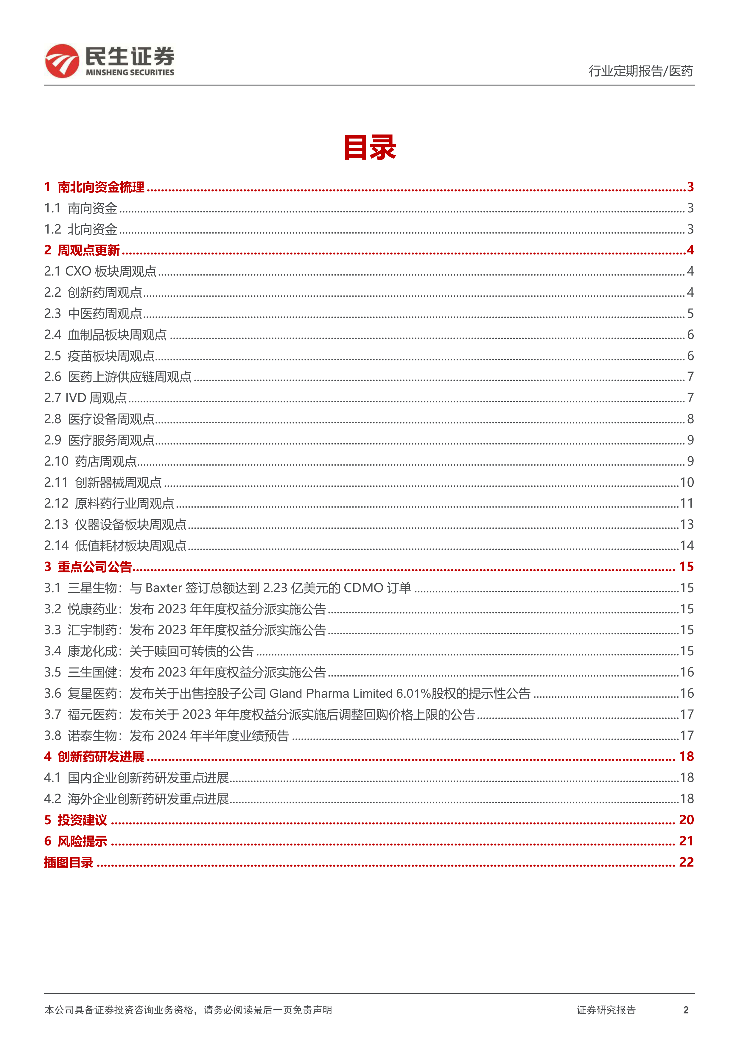 风险提示:集采压力大于预期风险;产品研发进度不及预期风险;竞争加剧风险;政策监管环境变化风险;药物研发服务市场需求下降的风险。