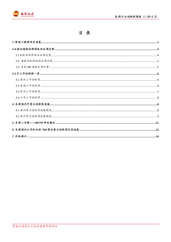 本报告对2023年2月第一周医药行业创新药市场进行了全面的数据分析,涵盖了新冠口服药研发进展、A股和港股创新药板块走势、2月份上市创新药情况、本周国内外重点创新药进展、HIF-PH抑制剂研发概况以及本周重点交易等方面。报告数据翔实,分析客观,为投资者提供了有价值的市场信息和参考依据。 需要注意的是,医药行业受政策、研发风险等多种因素影响,投资需谨慎。