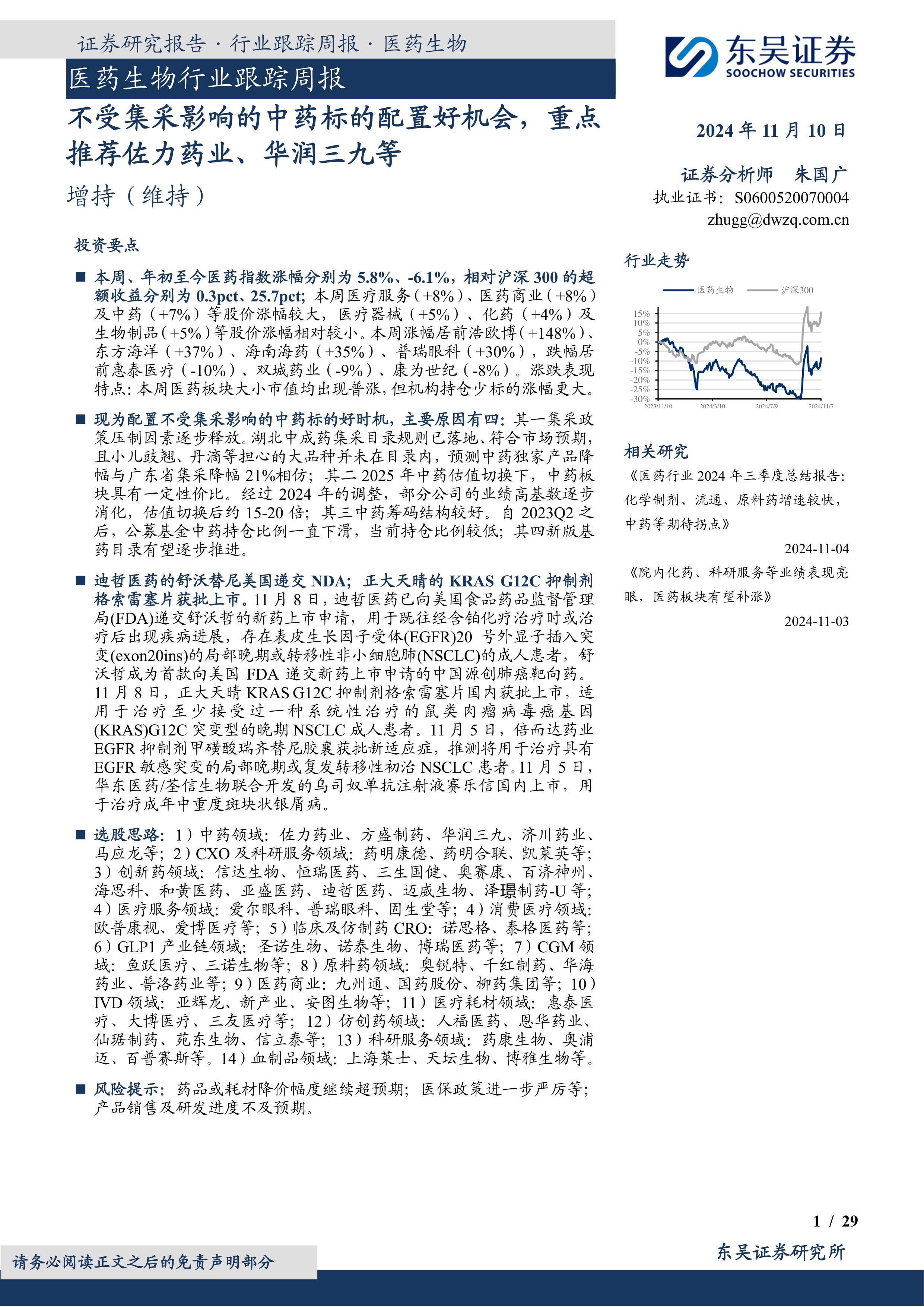 本报告基于对医药生物行业近期市场表现、政策变化以及企业动态的综合分析,认为当前是配置不受医保集采影响的中药标的的良好时机。 报告详细阐述了这一判断的依据,并提供了具体的选股思路和公司推荐,为投资者提供了重要的参考信息。 然而,报告也指出了药品或耗材降价幅度超预期、医保政策进一步收紧以及产品销售及研发进度不及预期等潜在风险。 投资者在进行投资决策时,应充分考虑自身风险承受能力和投资目标,并结合其他信息进行综合判断。