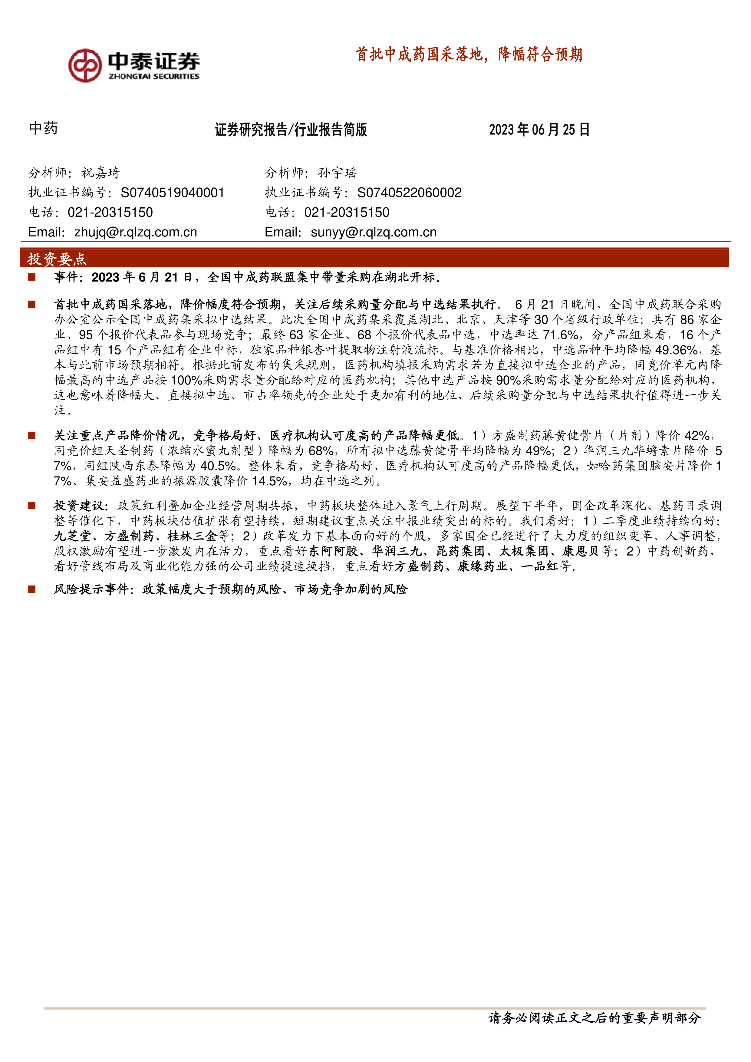 事件:2023年6月21日,全国中成药联盟集中带量采购在湖北开标。
