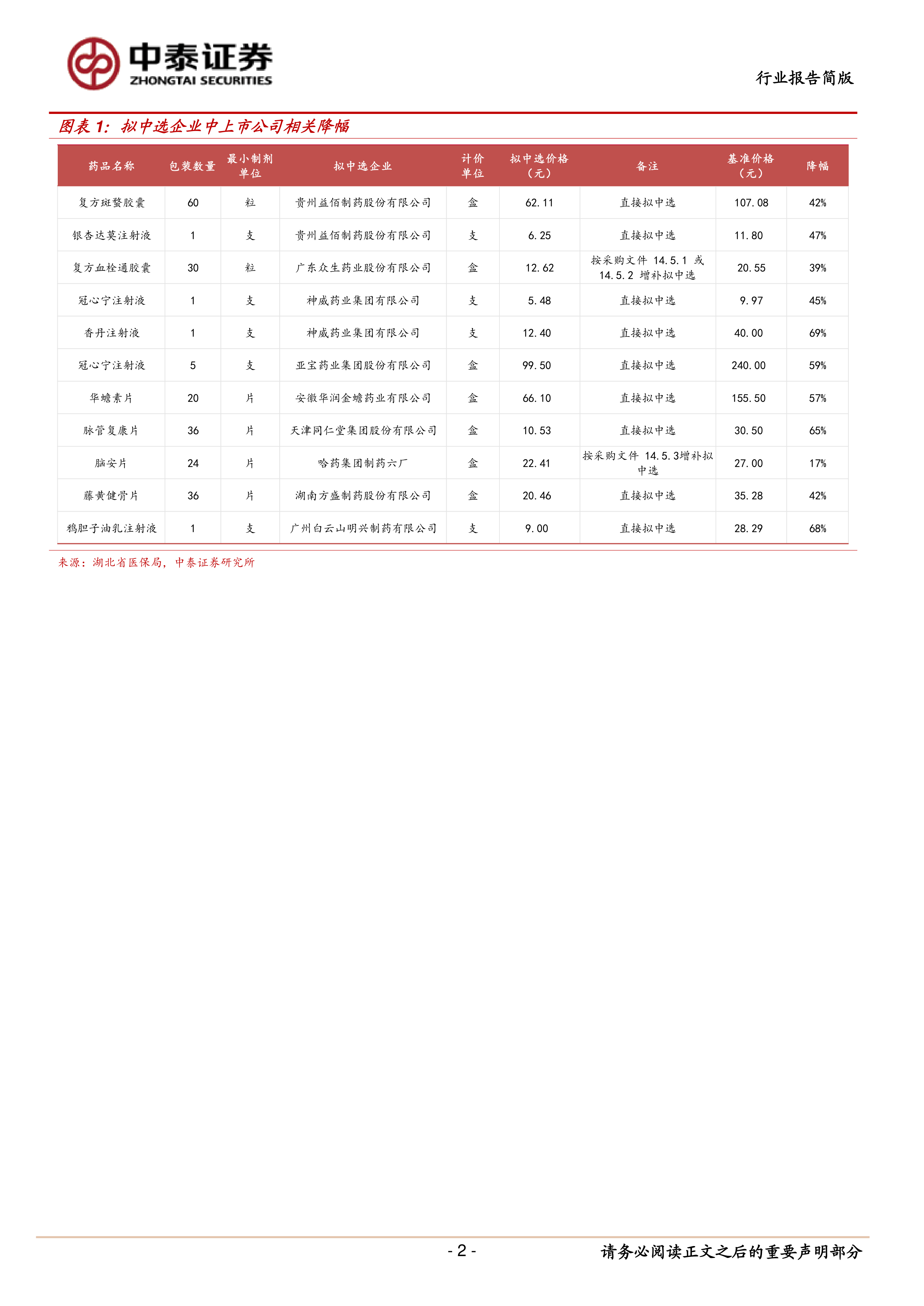 关注重点产品降价情况,竞争格局好、医疗机构认可度高的产品降幅更低。1)方盛制药藤黄健骨片(片剂)降价42%,同竞价组天圣制药(浓缩水蜜丸剂型)降幅为68%,所有拟中选藤黄健骨平均降幅为49%;2)华润三九华蟾素片降价57%,同组陕西东泰降幅为40.5%。整体来看,竞争格局好、医疗机构认可度高的产品降幅更低,如哈药集团脑安片降价17%、集安益盛药业的振源胶囊降价14.5%,均在中选之列。